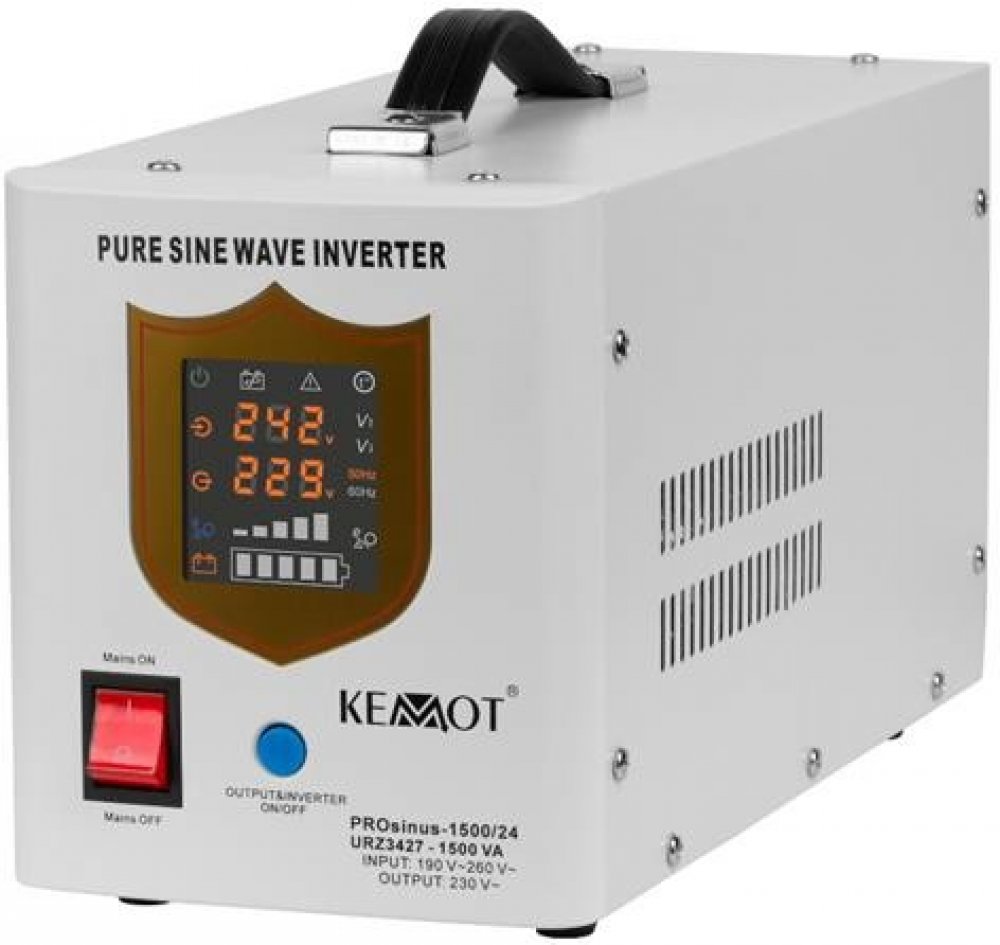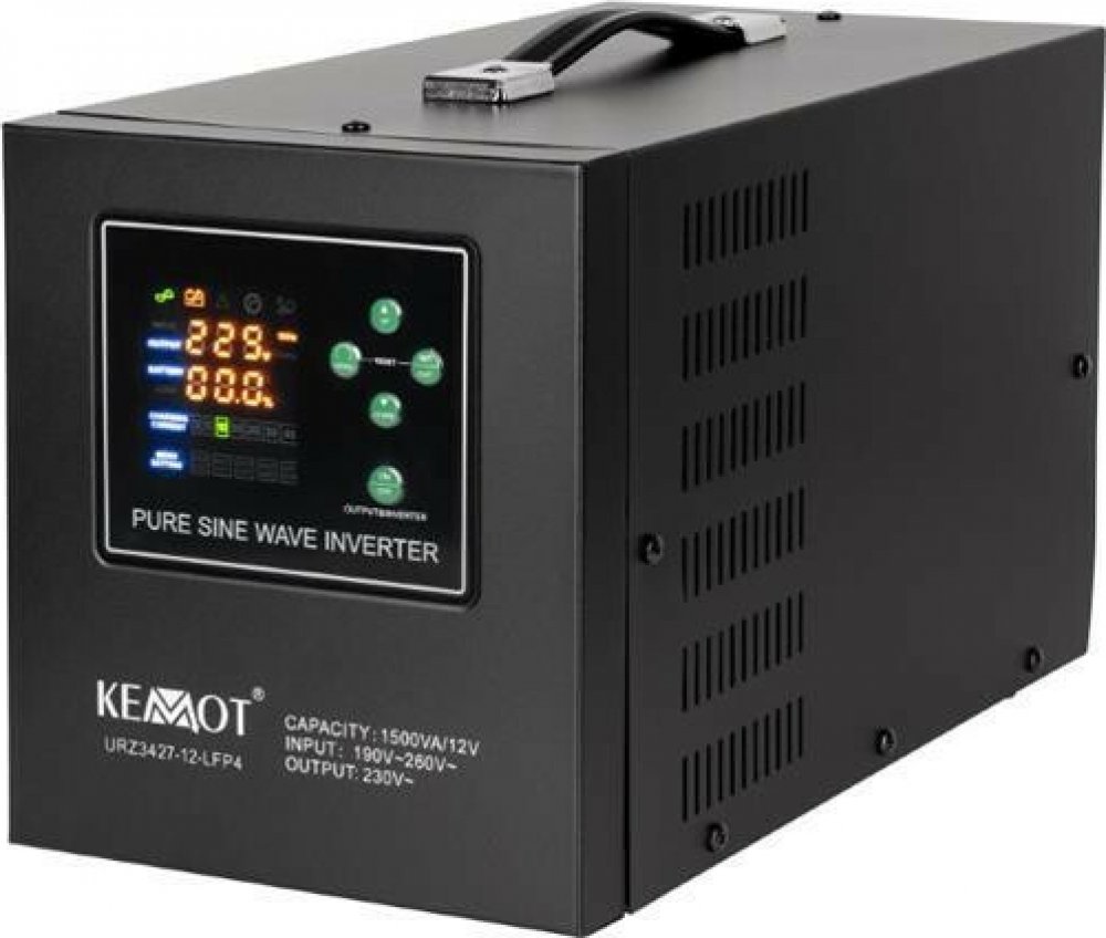 Nouzový zdroj napájení KEMOT PROsinus-1500-LFP4 Technické parametry: Jmenovitý výkon: 1050 W Typ baterie: 12 V DC Maximální napětí baterie: 15 V DC Rozsah vstupního napětí: 190 - 260 V AC Vstupní frekvence: 45 - 60 Hz Rozsah výstupního napětí: 206 - 242 V AC +/-5 % / Měnič: 230 V AC +/-3 % Výstupní frekvence: 50/60 Hz +/-0,5 Hz Tvar výstupního napětí: Čistá sinusová vlna Účinnost výstupu: >= 85 % (DC na AC) Nabíjecí proud baterie: Max. 20 A Kapacita baterie: 50–200 Ah (doporučená: 55 Ah) Odhadovaná doba nabíjení: 4–14 hodin (v závislosti na kapacitě baterie)