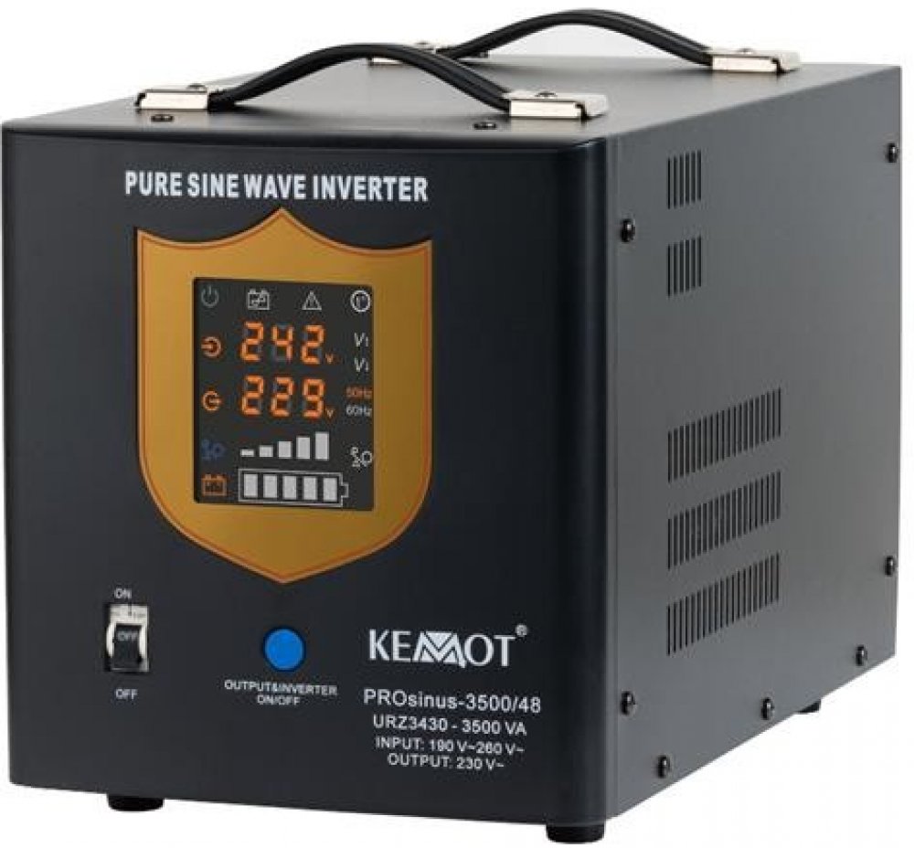 Nouzový napájecí invertor s čistou sinusovkou a funkcí nabíjení KEMOT PROsinus-3500/48 Technické parametry:- Jmenovitý výkon: 2400 W- Typ baterie: 48 V DC- Maximální napětí baterie: 60 V DC- Rozsah vstupního napětí: 190 - 260 V AC- Vstupní frekvence: 45 - 60 Hz- Rozsah výstupního napětí: 230 V AC +/- 5 % / Měnič: 230 VAC +/- 3 %- Výstupní frekvence: 50/60 Hz +/- 0,5 Hz- Tvar výstupního napětí: Čistá sinusovka- Výstupní účinnost:> = 85 % (DC na AC)- Nabíjecí proud baterie: Max.10 A- Doba sepnutí: = - Ochrana: Proti přetížení, zkratu, příliš vysokému nebo příliš nízkému napětí- Přípustná provozní teplota: 0 - 40 °C- Přípustná vlhkost vzduchu: 10 - 90 %v