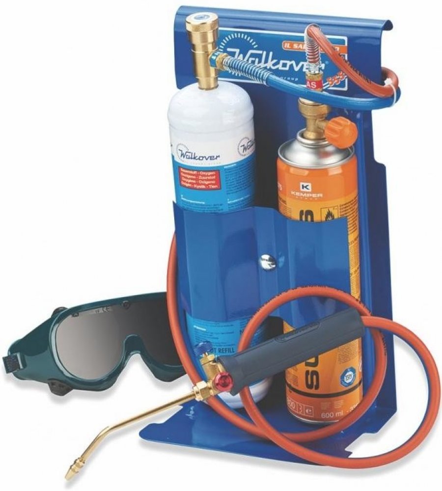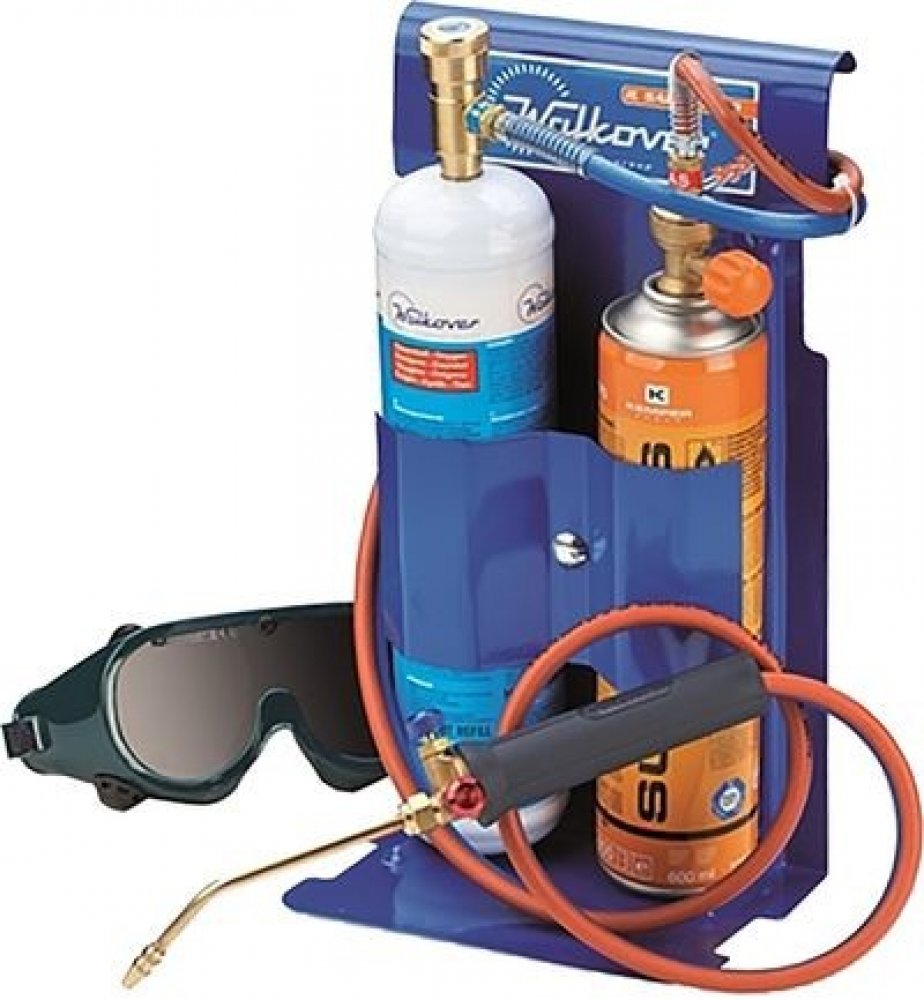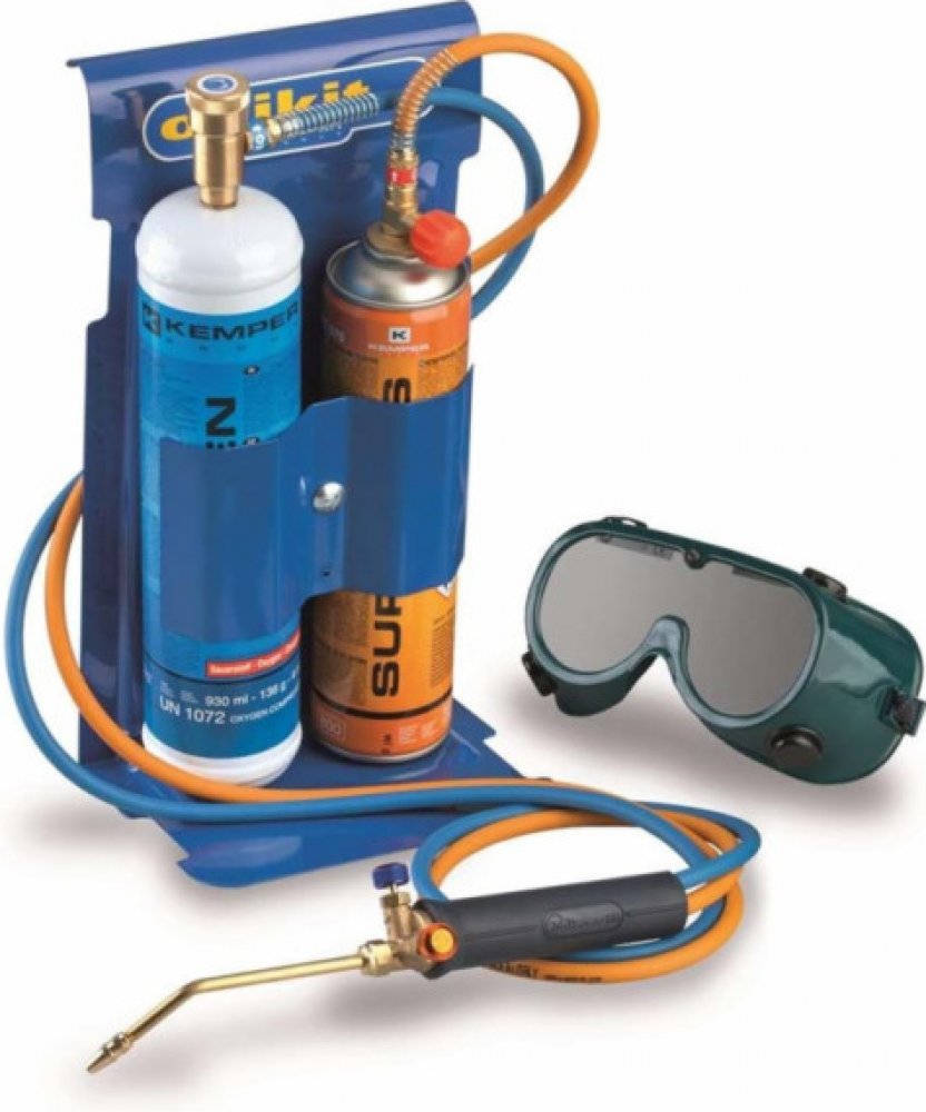 - Souprava obsahuje - rukojeť se svářecím nástavcem, tryskou 0,5mm a 2m hadicemi - náhradní trysku 0,65 mm - redukční ventil pro kyslík - uzavírací ventil pro plyn - kartuše s kyslíkem - kartuše s plynem Supergas 575 - stojan.