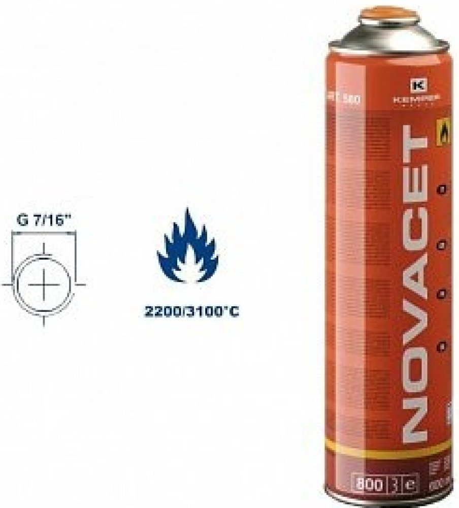 Plynová ventilová kartuše Novacet se standardním evropským závitem obsahuje propan + procentuální podíl aditiv, které výrazně zlepšují stabilitu a teplotu plamene, navíc výrazně snižují karbonizaci. Novacet je vhodný pro pájení i svařování. Zámrzná teplota Novacetu je na hranici minus 45°C, to znamená vysokou odparnou kapacitu v každé roční době, v jakémkoli počasí.