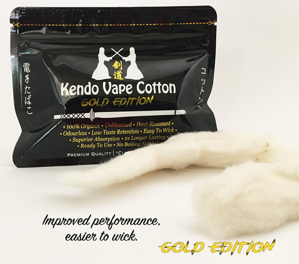 Kendo Cotton Gold Edition je 100% organická vata z Japonska. Vata byla speciálně vyvinuta pro vaping. Vata je pěstována bez pesticidů a není dodatečně bělena. Všechny tyto úpravy zaručují ten nejlepší zážitek z vapingu. Vata se vyznačuje vyšší odolností vůči teplu a déle odolává připálení. Dále skvěle absorbuje e-liquid s vysokým poměrem VG (rostlinného glycerolu). N emá žádnou chuť a tak zvládne podat tu nejčistší a nezkreslenou chuť e-liquidu. Mezi další zajímavé vlastnosti patří odolnost vůči chuti, kterou není schopna si dlouho udržet, tudíž je ideální pro častější střídání příchutí. Vatu lze použít v jakékoli žhavící hlavě včetně DIY a RBA atomizérů.