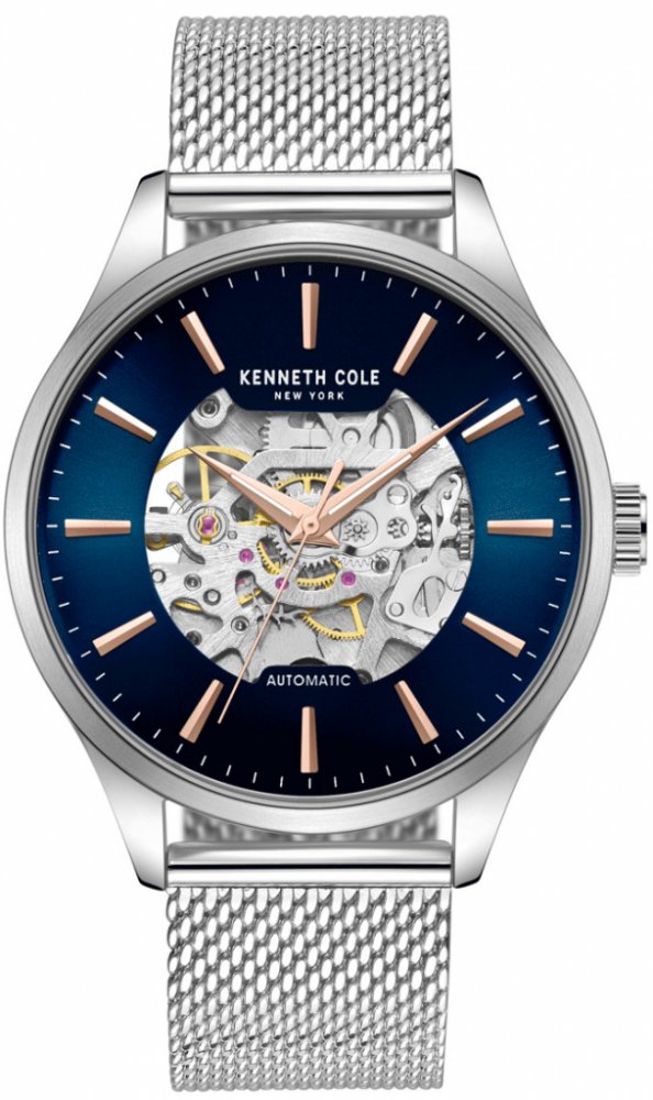 Kenneth Cole analogové ocel elegantní pánské automatické pro běžné použití (30–50 m) 42.0 mm ocel 30 m automatické minerální kulaté stříbrná modrá posuvná spona na ruku bez číslic stříbrná ocel 4.2 cm střední pevná ocel s občasnou údržbou (automatické)