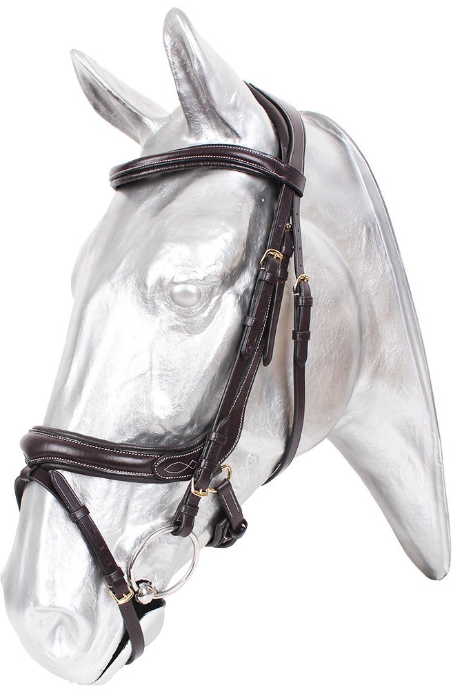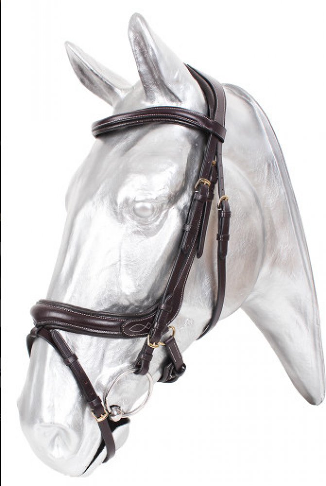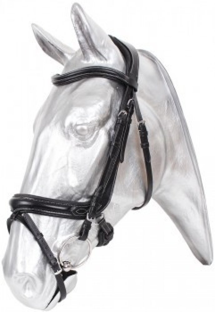 Anatomická uzdečka s kontrastním prošitím. Speciálně anatomicky tvarovaný nánosník minimalizuje tlak na důležité nervy na hlavě koně. Anatomický měkce vypolstrovaný nátylník rozkládá tlak na zátylek koně a umožňuje lepší pohyb uší. Rozšířený polstrovaný podbradník. Dodáváno včetně plátěných otěží se zarážkami.