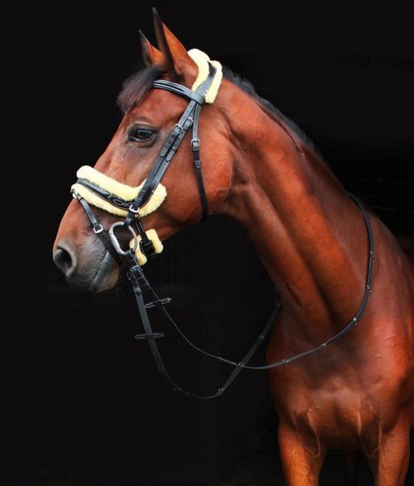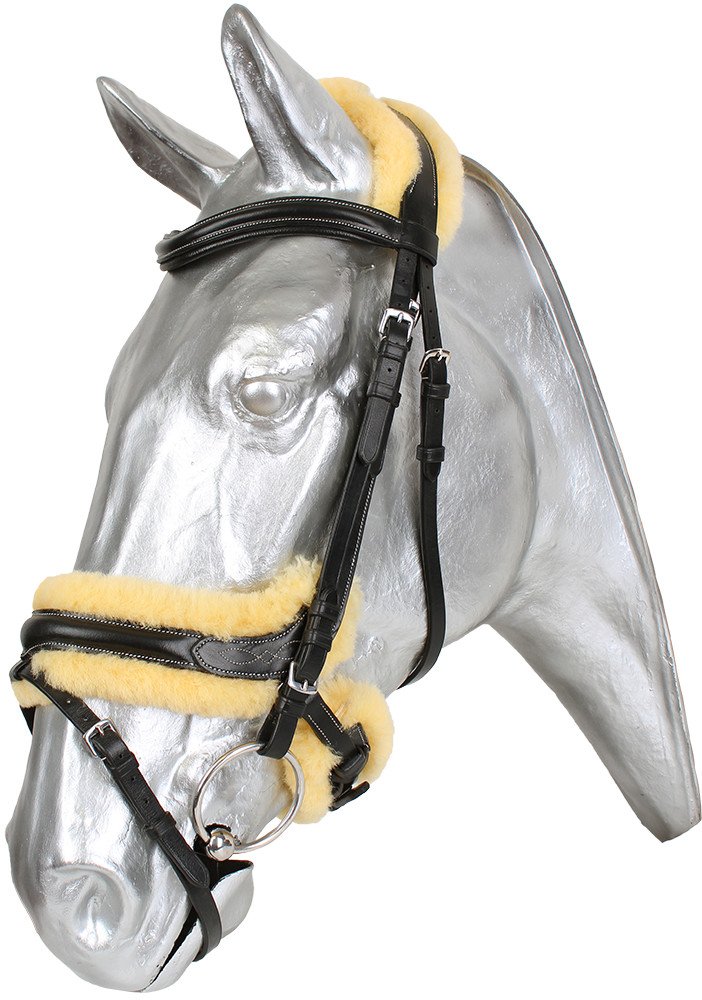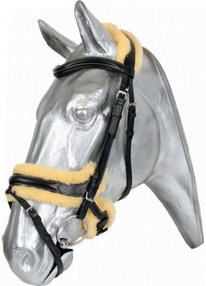 Anatomická uzdečka s kontrastním prošitím. Speciálně anatomicky tvarovaný, beránkem podložený nánosník minimalizuje tlak na důležité nervy na hlavě koně. Anatomický nátylník rozkládá tlak na zátylek koně a umožňuje lepší pohyb uší. Rozšířený polstrovaný podbradník. Dodáváno včetně plátěných otěží se zarážkami.