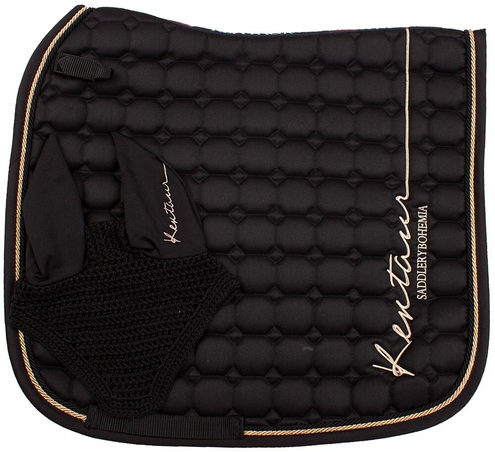 Elegantní drezurní sada značky Kentaur spojuje moderní funkčnost s designovou elegancí. Dečka je olemována výraznou dvojitou kroucenou šňůrou a opatřena výšivkou v odstínu rosegold. Spodní vrstva je vyrobena z hi-tech materiálu, který absorbuje pot a podporuje prodyšnost, což zvyšuje pohodlí pro koně během jízdy. Součástí balení jsou i náušníky ve stejném barevném provedení, které tvoří vizuálně j...