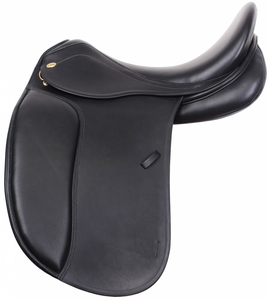 Drezurní sedlo na hluboké kostře. Vysoká opěrka na suchý zip. Krátký sedlový francouzský polštář sedlo předurčuje na koně s kulatým, rovným, krátkým nebo přestavěným hřbetem.