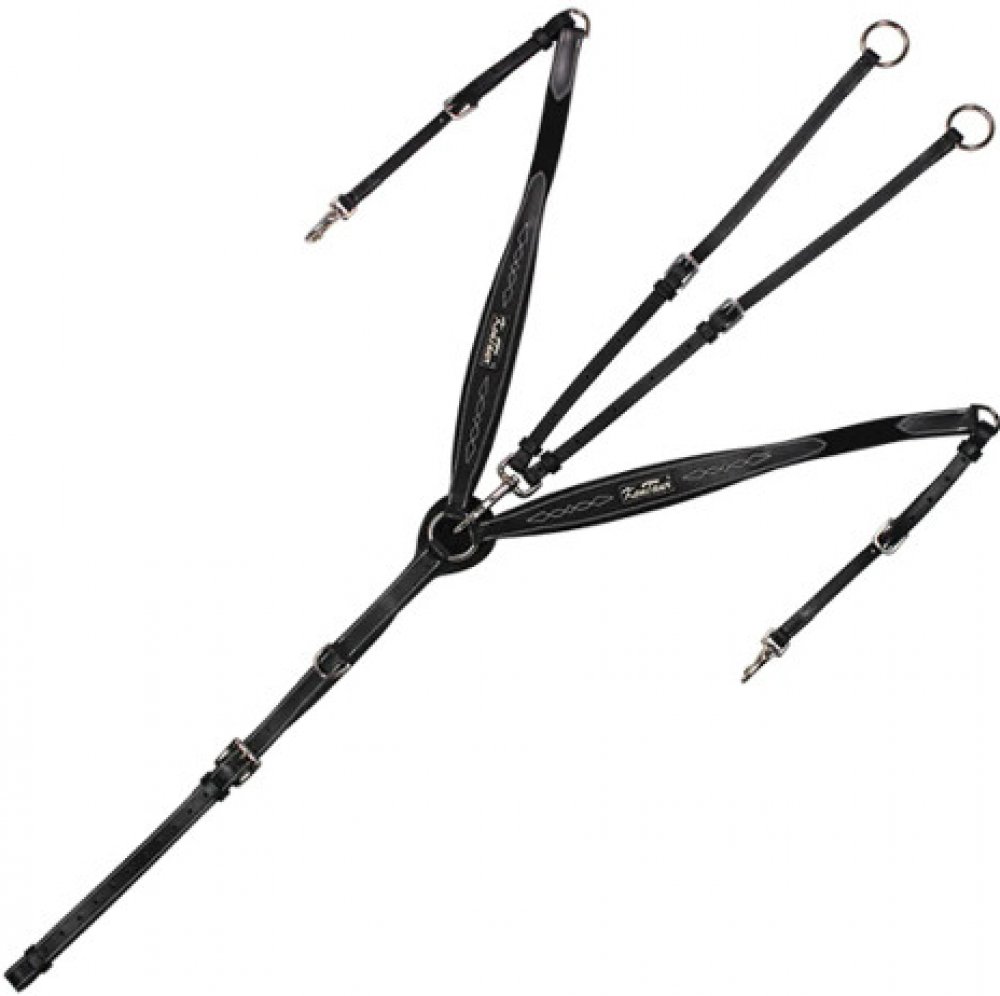 Oblíbený kožený honební poprsník od KenTaur. Díly na pleci jsou měkce polstrované, navíc ozdobené dekorativním proševem a pro maximální komfort koně doplněné krátkou gumou. Možnost nastavení velikosti přezkami. Martingalová vidlice je součástí poprsníku.