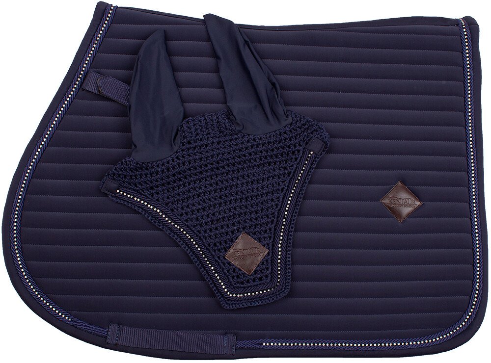 Tento designový set od značky Kentaur zahrnuje podsedlovou dečku a náušníky v jednotném stylu. Dečka vyniká vodorovným prošíváním a je vyrobena z prodyšného softshellového materiálu, který zajišťuje komfort při jízdě. Luxusní vzhled dotváří jemné perličkové lemování a decentní kožené logo Kentaur. Praktický nylonový pásek umožňuje snadné a pevné protažení podbřišníku. Náušníky jsou sladěné s dečko...