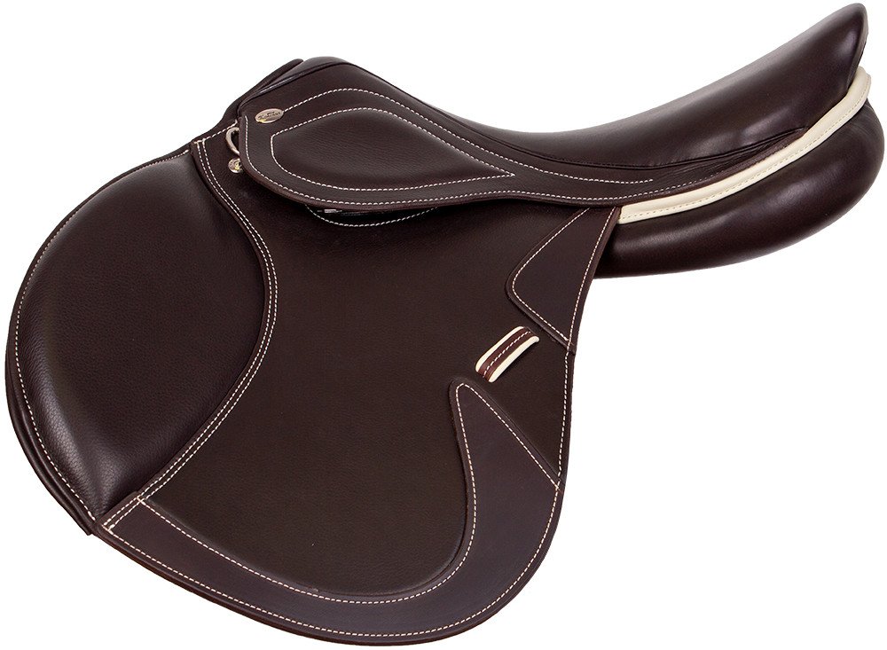 Skokové sedlo kategorie profi postavené na mělké kostře. Komfortní polštář z měkké pěnové hmoty s pevnějším jádrem je půdorysně široký, plochý a anatomicky tvarovaný na lopatce. V přední části bočnic je paměťová pěna.