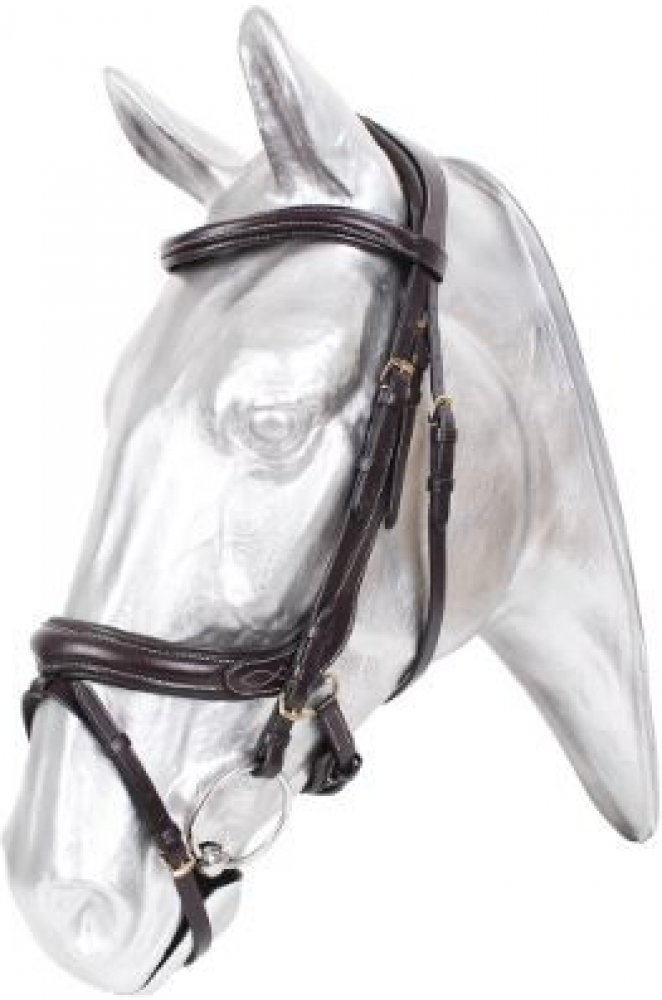 Kvalitní anatomická uzdečka s polstrovaným nánosníkem a nátylníkem zdobená kontrastním proševem.