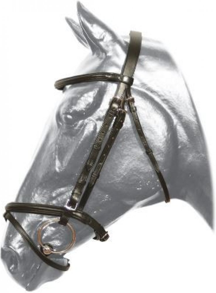 Uzdečka s anglickým nánosníkem, podložená čelenka i nánosník, včetně plátěných otěží. Ekonomická kvalita. Barva černá/nikl.