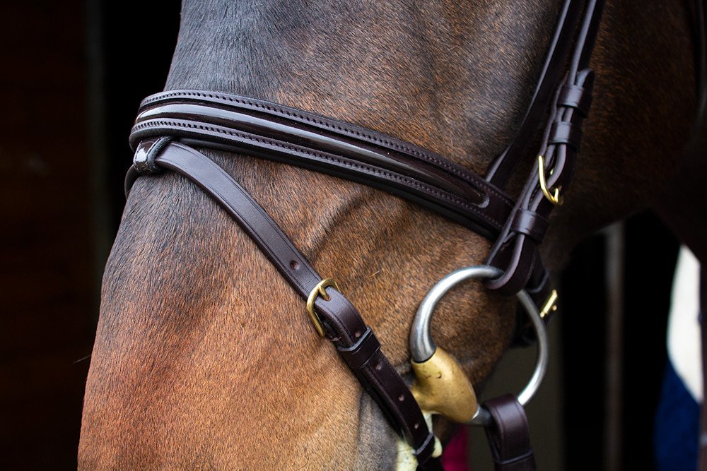 Uzdečka vyrobená z kvalitní italské kůže, prošívaná tón v tónu, s anatomickým nátylníkem a měkce vypolstrovaným anglickým nánosníkem přináší pro koně to největší pohodlí. Díky čelence a nánosníku zdobenému lakovanou kůží navíc vypadá velmi elegantně. Dodáváno včetně plátěných otěží se zarážkami.