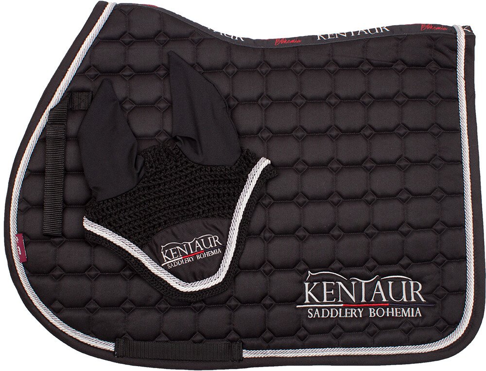 Oblíbený set Kentaur kombinuje všestranně tvarovanou podsedlovou dečku a sladěné náušníky s logem. Dečka je vyrobena z kvalitního prodyšného materiálu a je vybavena poutky pro uchycení k sedlu a podbřišníku. Spodní vrstva z hi-tech textilie výborně odvádí pot a pomáhá udržet koně v suchu. Elegantní vzhled doplňuje dekorativní dvojitý lem. Náušníky mají elastické uši a přední část zdobí logo Kentau...