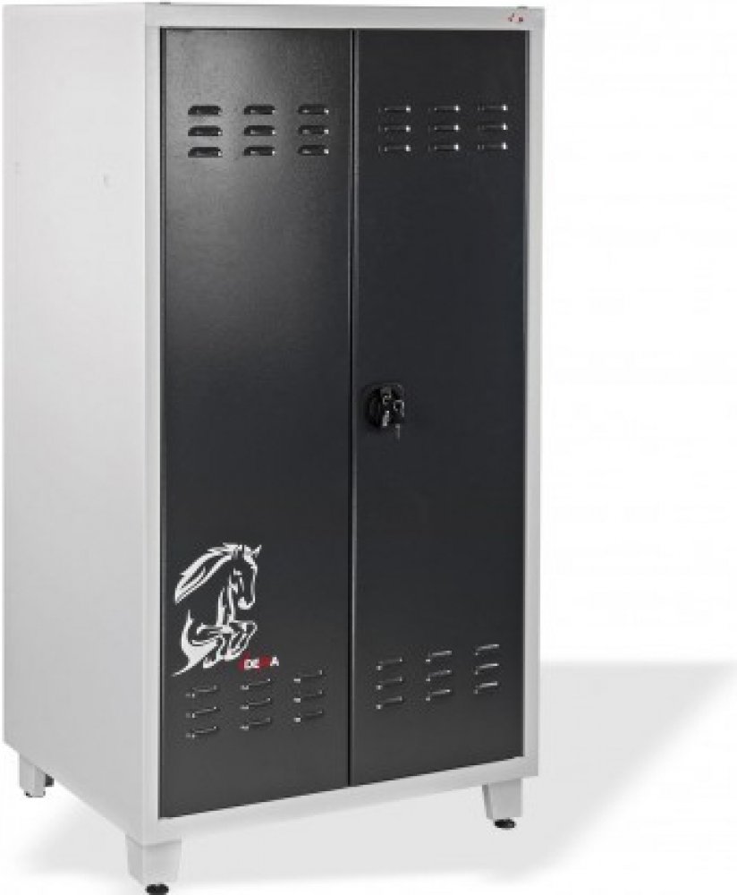 Skříň do každé sedlovny a jízdárny pro bezpečné uložení sedla a jezdeckého příslušenství. Pro snadné naložení a vyložení sedel lze každý držák zvlášť zavěsit / vyvěsit. Háčky na dveřích využijete pro udidla, uzdy a lonžovací lana, horní a spodní poličku pro ošetřovací prostředky a deky. Vyjímatelná horní polička. Výškově přestavitelné nohy pro vyrovnání nerovností podlahy. Dobré odvětrání, odolná prášková barva.