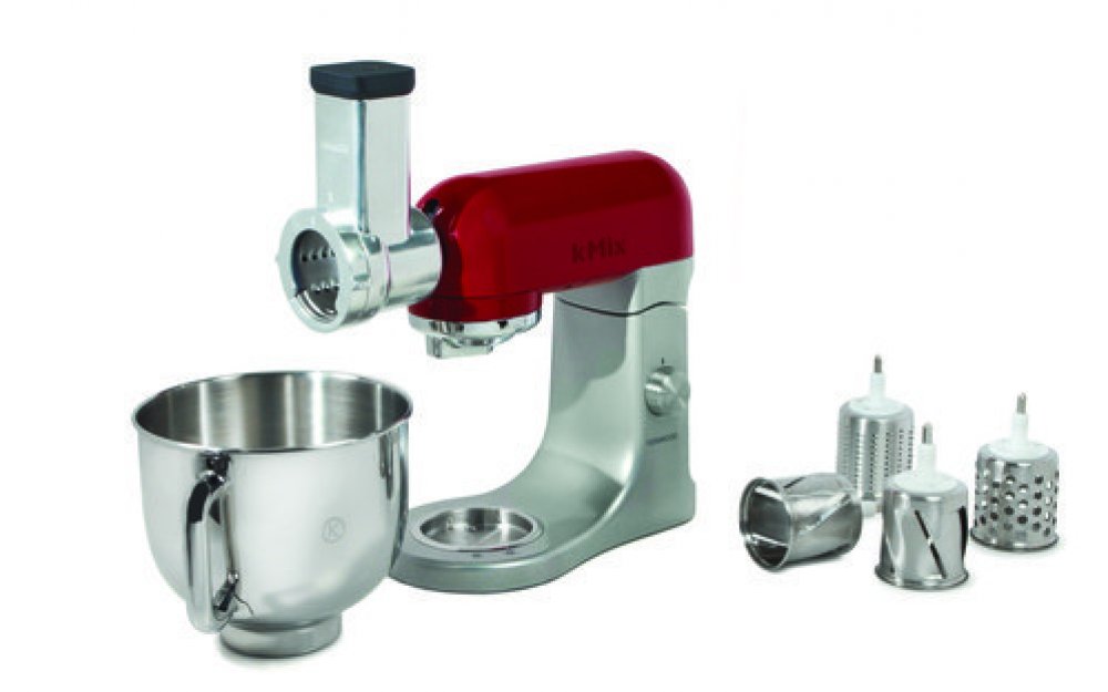 Kovový kuchyňský robot s červeně lakovanou hlavou