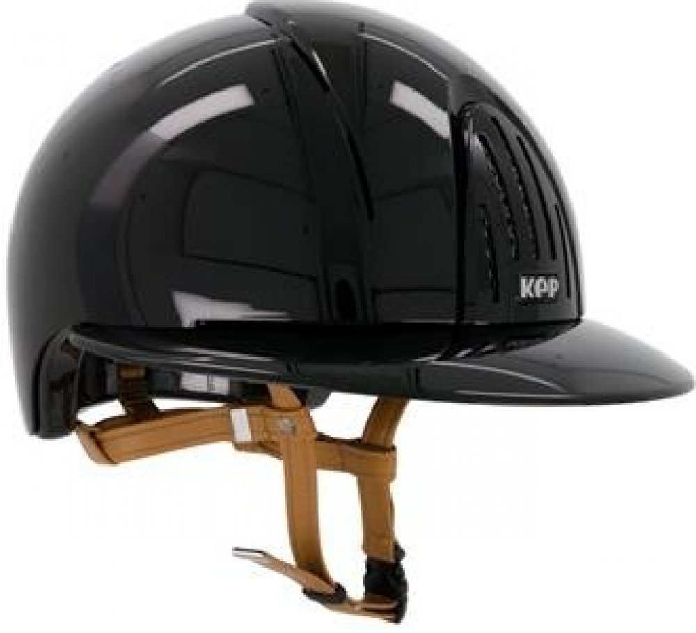 Jezdecká bezpečnostní helma KEP Italia s širokým POLO kšiltem a inovativní technologií pro maximální bezpečnost jezdce. Lesklý černý design s černou mřížkou a rámečkem doplňují elegantní řemínky v hnědé barvě.