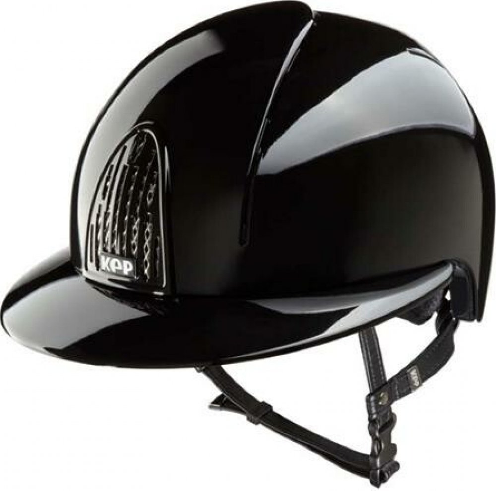 Jezdecká bezpečnostní helma KEP Italia s širokým POLO kšiltem a inovativní technologií pro maximální bezpečnost jezdce. Lesklý černý design s černou mřížkou a rámečkem.