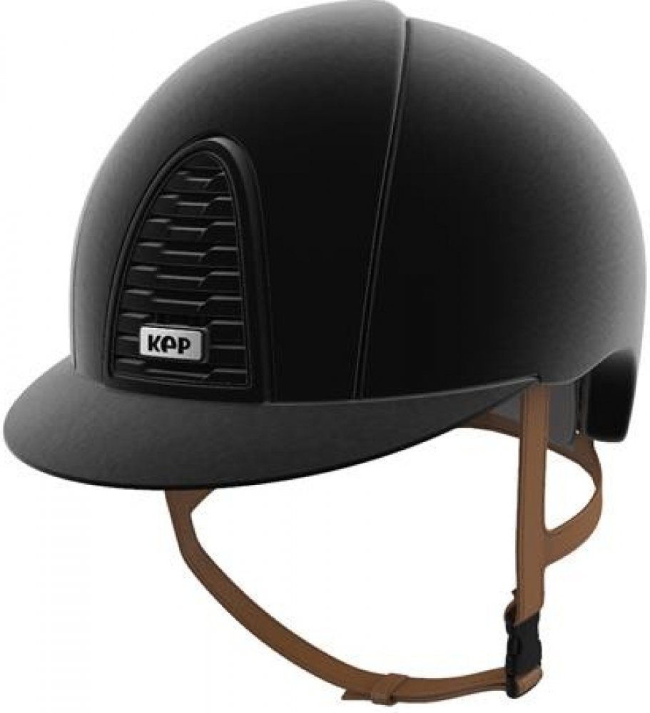 Bezpečnostní přilba italské značky KEP v černé barvě se semišovým designem, s mřížkou a rámečkem ve stejné barvě. S hnědými podbradními řemínky.