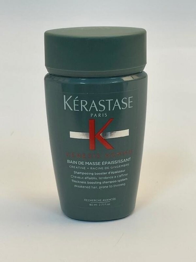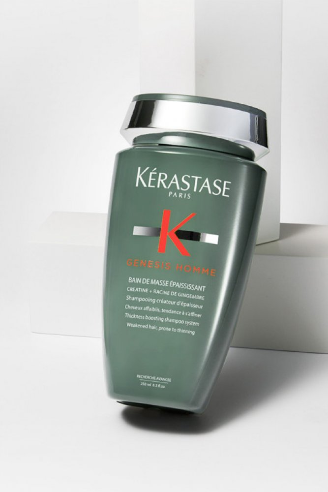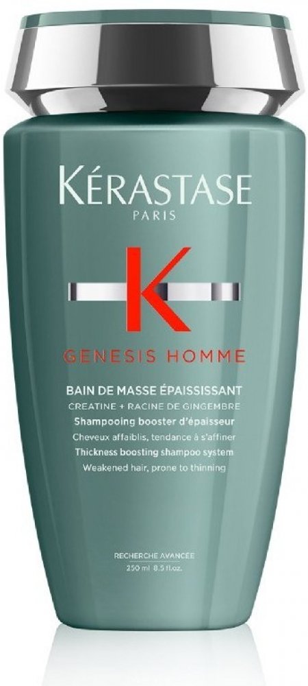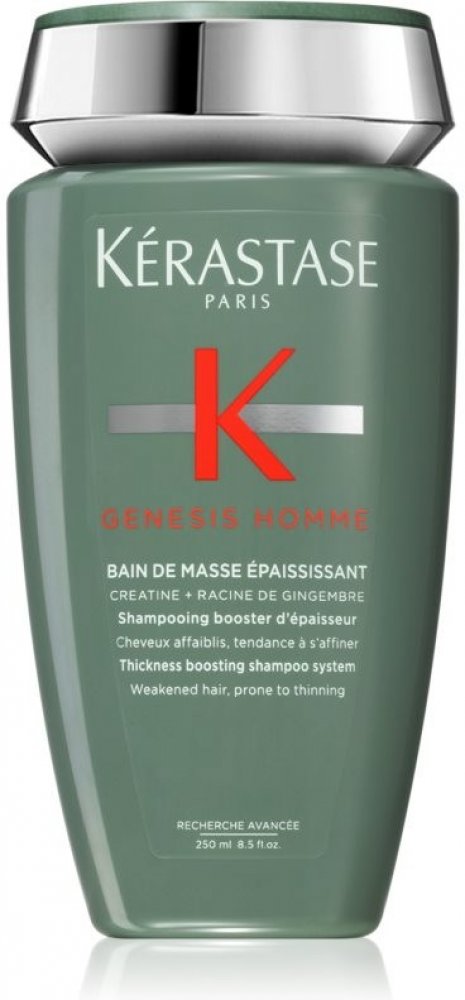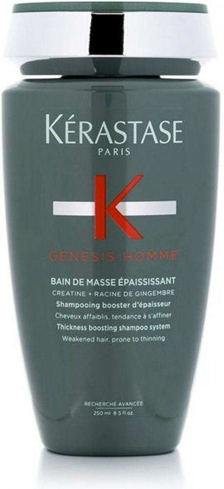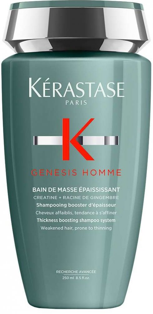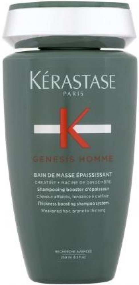 Křehké a slabé vlasy se sklonem k lámání a vypadávání vám pomůže posílit a zahustit šampon Kérastase Genesis Homme Bain de Masse Épaississant. Šetrně a důkladně umyje pokožku hlavy, vlasy i vousy a díky obsahu kreatinu, extraktu ze zázvorového kořenu a aminexilu tenké vlasové vlákno od kořínků posílí a hydratuje. Vlasy získají objem a plnost, budou se méně lámat a vypadávat. Vypadávání vlasů v důsledku lámání šampon z pánské řady Genesis Homme snižuje až o 85 %.