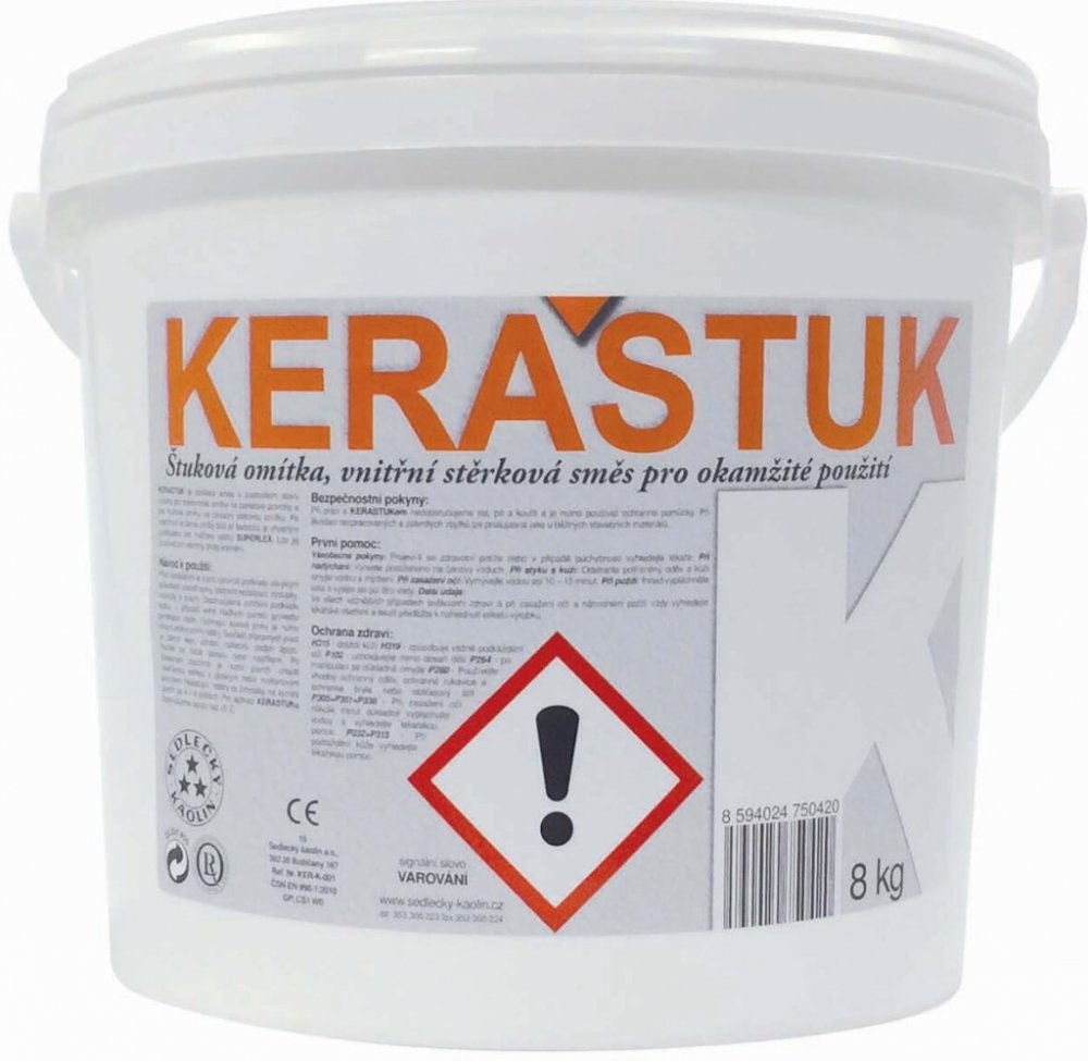 Keraštuk K je tekutá omítková směs obsahující jemný křemičitý písek, vápno, hydraulické a organické pojivo, plavený kaolin a vodu. Je určen jako tenkovrstvá povrchová úprava na panelové povrchy a pro štukové omítky na základní jádrovou omítku. Je připraven pro okamžité použití a lze jej používat pro všechny druhy interiérů. Keraštuk K je po zaschnutí šedobílý, takže další úprava již není nutná, lze ji však provést na vyzrálý povrch, tj. min. po 4 týdnech a je vhodným podkladem pro malířské nátěru SUPERFLEX. Technické parametry: Obsah sušiny: min 65 % Zbytek na sítě za mokra: síto 0,5 mm - max. 5 %/ síto 1,0 mm - max. 0,1 % Zpracovatelnost na betonu: min. 40 minut Přídržnost k betonovému podkladu: 0,2 Mpa Otěruvzdornost povrchové úpravy (ČSN 73 2582): min. 75 s Návod k použití Podklad je vhodné očistit od prachu a jiných nečistot a navlhčit, větší nerovnosti opravit základní omítkou. Na panelových stěnách opravit poškozená místa a odstranit výstupky na povrchu a zaspárovat spáry. Příliš hladký beton je dobré natřít penetračním nátěrem ředěným vodou 1 l : 4-5. Kovové prvky je vhodné chránit antikorozním nátěrem, zárubně, okna, radiátory apod. před omítáním zakrýt. Na 1 m2 - při souvislé tloušťce vrstvy 1,5 mm - vystačí 2-3 kg Keraštuku. Teplota skladování: +1 až +30 °C. Podrobnější informace naleznete v technickém listu k dispozici ke stažení.