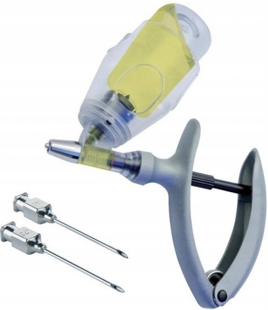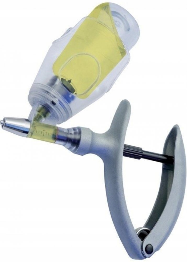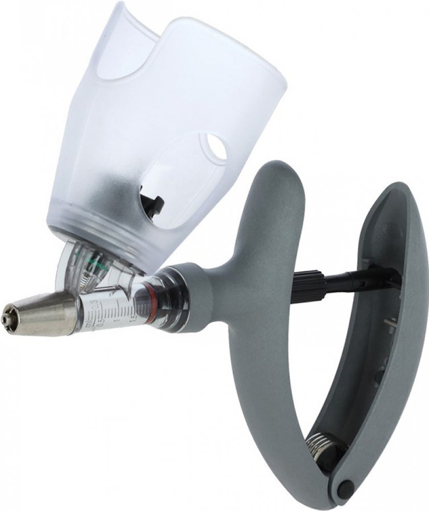 Očkovací injekční automat, s nástavcem na lahvičky, nastavitelné a přesné dávkování, kovový jehlový nástavec, robustní plastový kryt, skvělý poměr cena/výkon, dávkování 0,2 - 2 ml.