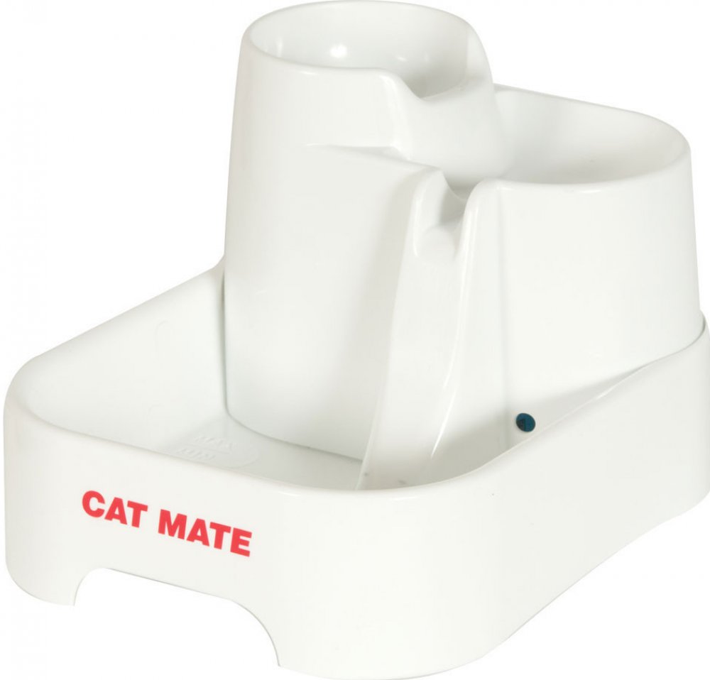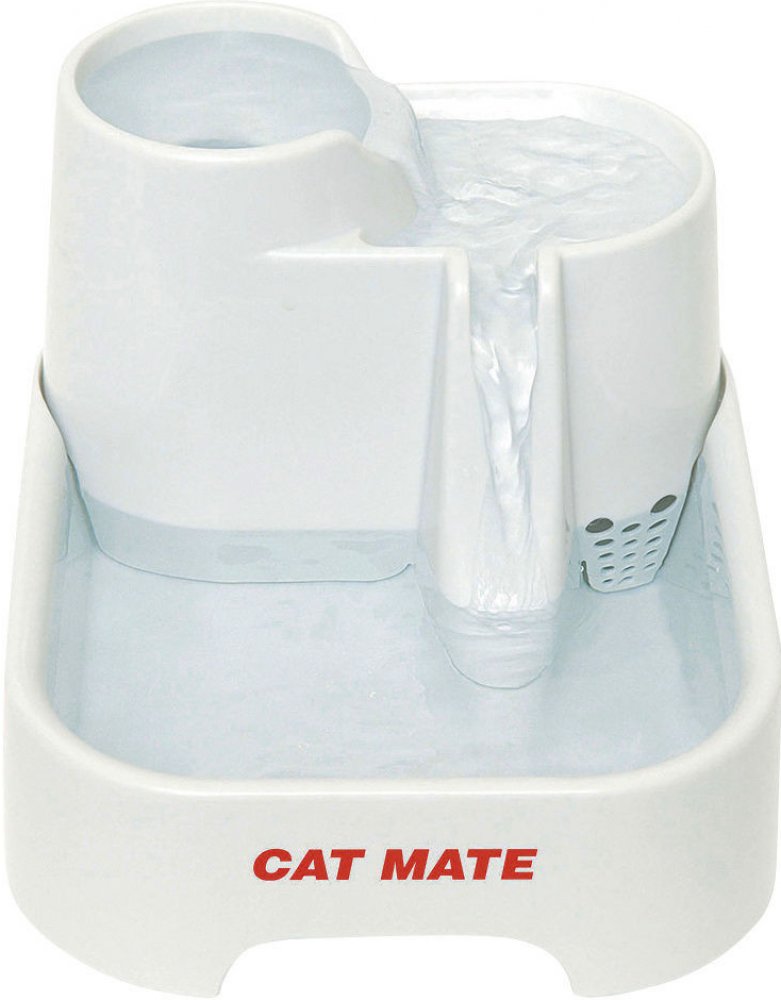 Velká plastová fontánka Cat Mate, vhodná pro psy i kočky, zajistí dostatečný přísun vody. Izolovaný čerpací systém zaručuje velmi tichý chod. Uhlíkový filtr zajišťuje tekoucí čistou vodu.