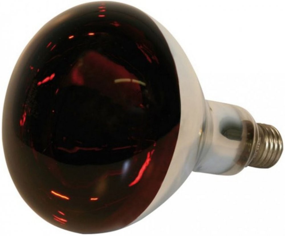 Tepelná červená infražárovka z tvrzeného skla pro ohřev selat a drůbeže. Výkon 150W, závit E27.