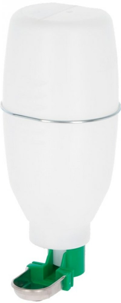 Napáječka pro králíky, pro snadné zavěšení, s nerezovým pítkem, průhledná plastová nádoba, objem 2 l, rozměry pítka 5,5x4 cm, výška napáječky 27 cm, průměr napáječky 12 cm.