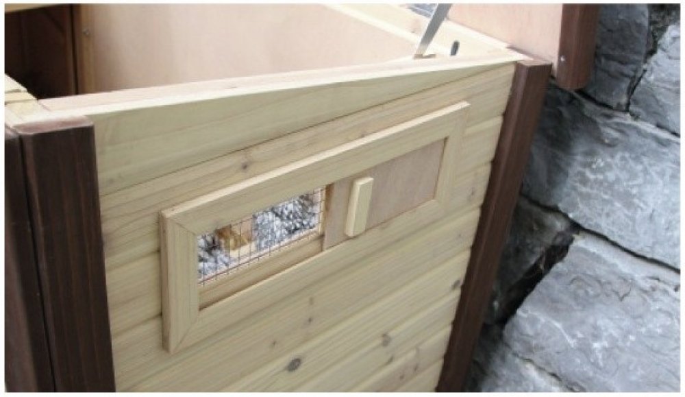 Kurník má dva vstupy. Větší vstup má výklopné dvířka, které slouží jako rampa pro snadný pohyb z a do kurníku. Dvířka obsahují dva bezpečnostní zámky proti predátorům. Menší dvířka obsahují zámek a okýnko pro prosvětlení interiéru. Na boční straně kurníku se nachází posuvné okýnko, které zajišťuje cirkulaci vzduchu.