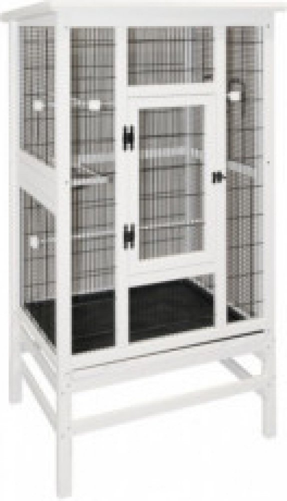 Voliéra pro papoušky a jiné ptactvo z masivního dřeva s ochranným bílým nátěrem.