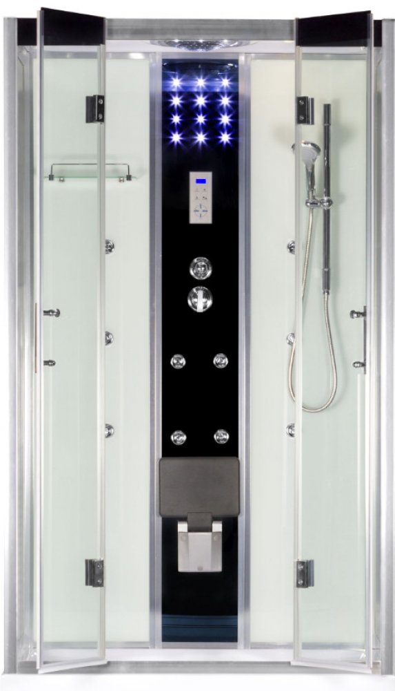 Masážní box Tuluza 120×80 nadstandardní provedení masážního boxu v bílém provedení o rozměrech 120x80x217 cm pantové otevírání dveří zaručuje bezproblémový chod po mnohá léta – dvoukřídlé dveře hliník chrom profily bezpečnostní tvrzené sklo přední 6mm, zádní tvrzené bezpečnostní sklo 4mm železná konstrukce pod vaničkou zaručí bytelnost vanička se dodává včetně sifonu Co mohu čekat od výbavy masážního boxu Tuluza 120×80 4x masážní trysky – středový panel 3x masážní trysky – po pravé zadní stěně 3x masážní trysky – po levé zadní stěně 12x diodové osvětlení ve středovém panelu hlavová stropní sprcha + ruční sprcha luxusní vodovodní baterie přepínač s přesným řazením funkcí mezi stropní, ruční sprchou a tryskami dotykový elektronický displej rádio ventilátor skleněná polička s mřížkou integrované sedátko zabudované ve středovém panelu