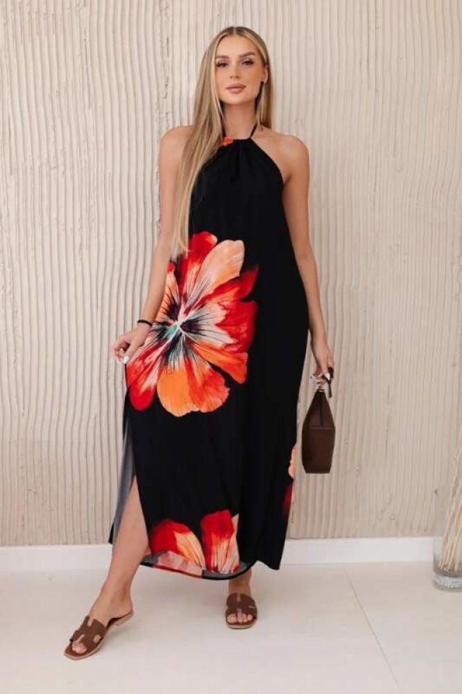 100% viskóza Kesi letní dlouhé bez rukávu áčkové černá květované s kulatým výstřihem malý výstřih