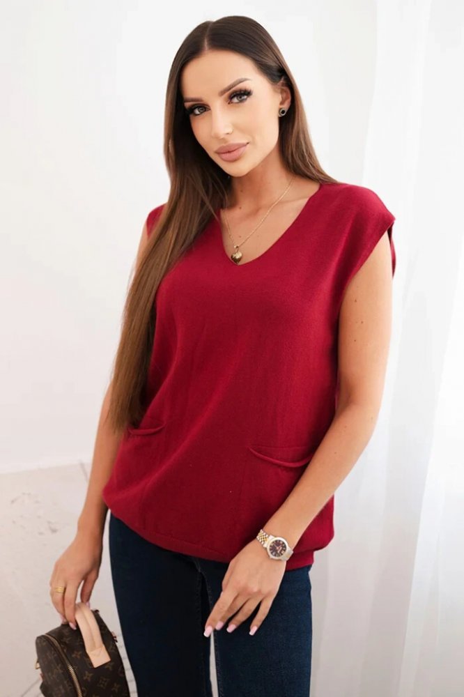 Kesi dámský viskózový svetr bez rukávů s kapsami a V Bordó