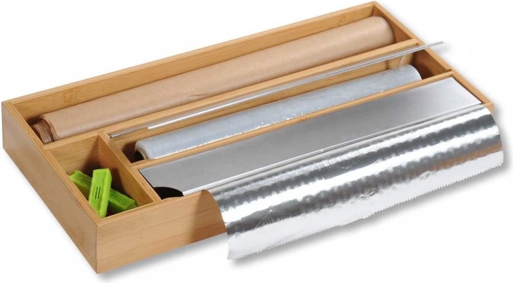 Už žádné zamotané roličky, přetržený konec fólie ani chaotická zásuvka. Tento praktický a elegantní organizér z bambusu nabízí hned 3+1 oddělené přihrádky – na potravinovou fólii, alobal i pečicí papír – a extra přihrádku na drobnosti, jako jsou svorky, gumičky nebo zavírací klipy. Každá rolička má svou vlastní ostrou nerezovou hranu, která umožňuje přesné a snadné odtržení bez zbytečného plýtvání.
