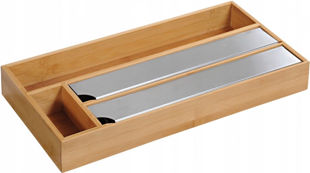 Dřevěná kuchyňská pomůcka pro hliníkovou, potravinářskou fólii a speciálním místem pro pečicí papír. Další výhodou je speciální místo pro kuchyňské sponky. Nyní můžete mít vše v jedné krabičce.