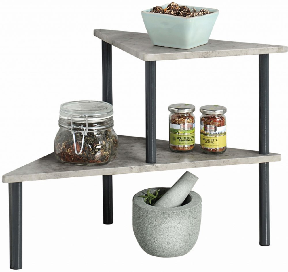 Tato chytrá konstrukce Vám pomůže zvětšit odkládací prostor v kuchyni a využít každý koutek. Kuchyňský regál se skládá se ze 2 poliček které mají trojúhelníkový tvar. Ideální umístění je na kuchyňské lince v rohu. Místo tady najdou např. misky, zavařeniny a různé drobné kuchyňské pomůcky nebo malé květináčky s bylinkami. Materiál: MDF- deska, vzor beton, konstukce kovová, tmavě šedá (antracit). Ro...