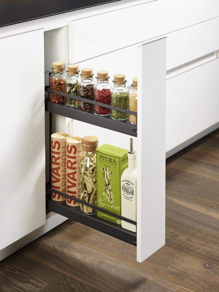 Dvířka jsou namontovaná na čele koše a jedním tahem koše vytáhnete ven před skříňku.
