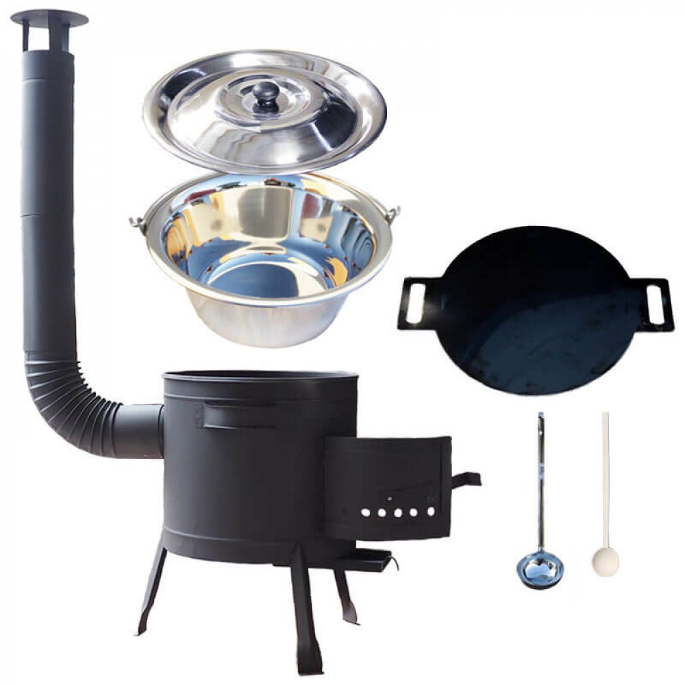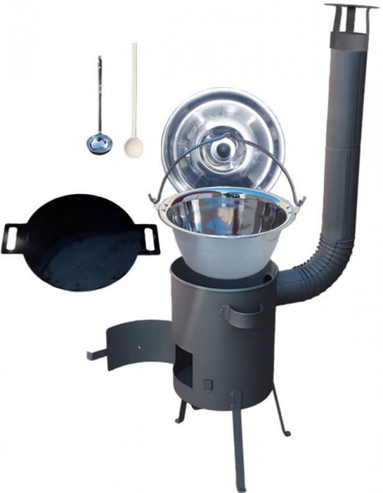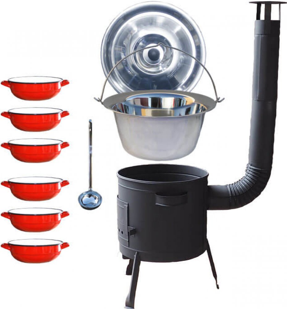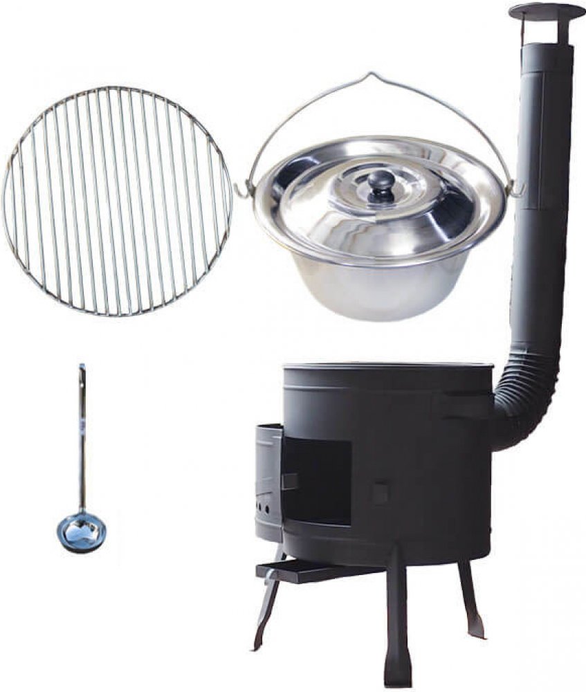 Kotlíková souprava obsahuje: Nerezový kotlík 1,2 mm INOX. Objem: 20 L. Nerezová poklice. Železná pánev na grilování, průměr 44 cm. Žáruvzdorná kotlina. Kotlina má zesílený rošt na popel v místě, kde vzniká největší teplota v kotlině. Dřevěná vařečka, smrk. Velikost: 50 cm. Kvalitní nerezová naběračka INOX. Kotlíková souprava pro outdorové vaření guláše a rybích polévek, pečení a grilování klobás, steaků, špekáčků, slaniny, masa, zeleniny a jiných pochutin v přírodě, v zahradě nebo v otevřené kuchyně, především pro chalupáře, chataře, do kempu a na táboření.