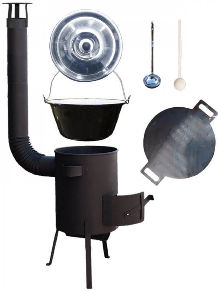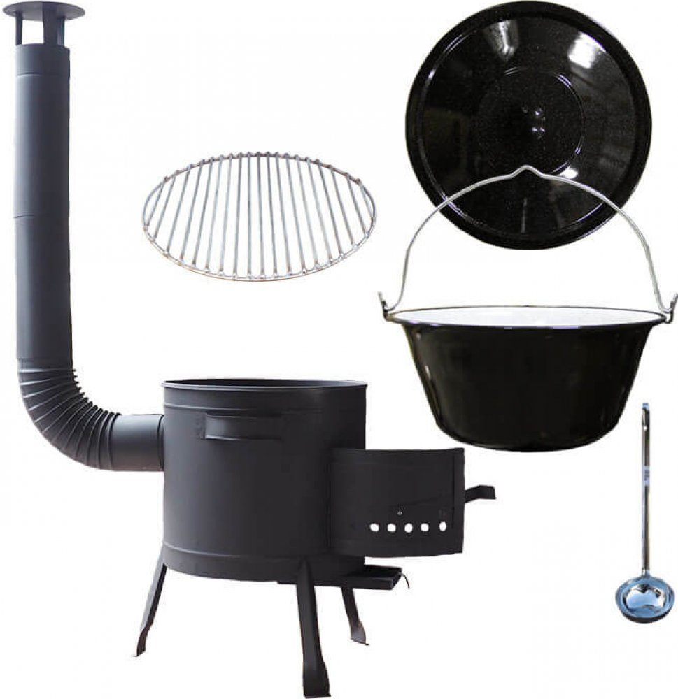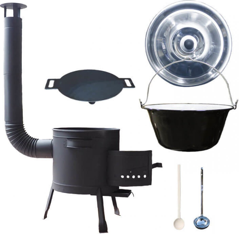 Kotlíková souprava obsahuje: Smaltovaný kotlík 1,2 mm SMALT. Objem: 20 L. Nerezová poklice. Železná pánev na grilování, průměr 44 cm. Žáruvzdorná nízká kotlina. Dřevěná vařečka, smrk. Velikost: 50 cm. Kvalitní nerezová naběračka INOX. Kotlíková souprava pro outdorové vaření guláše a rybích polévek, pečení a grilování klobás, steaků, špekáčků, slaniny, masa, zeleniny a jiných pochutin v přírodě, v zahradě nebo v otevřené kuchyně, především pro chalupáře, chataře, do kempu a na táboření.
