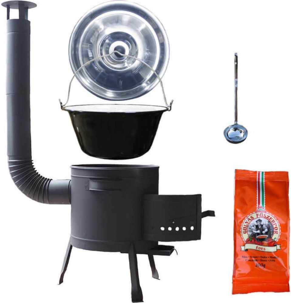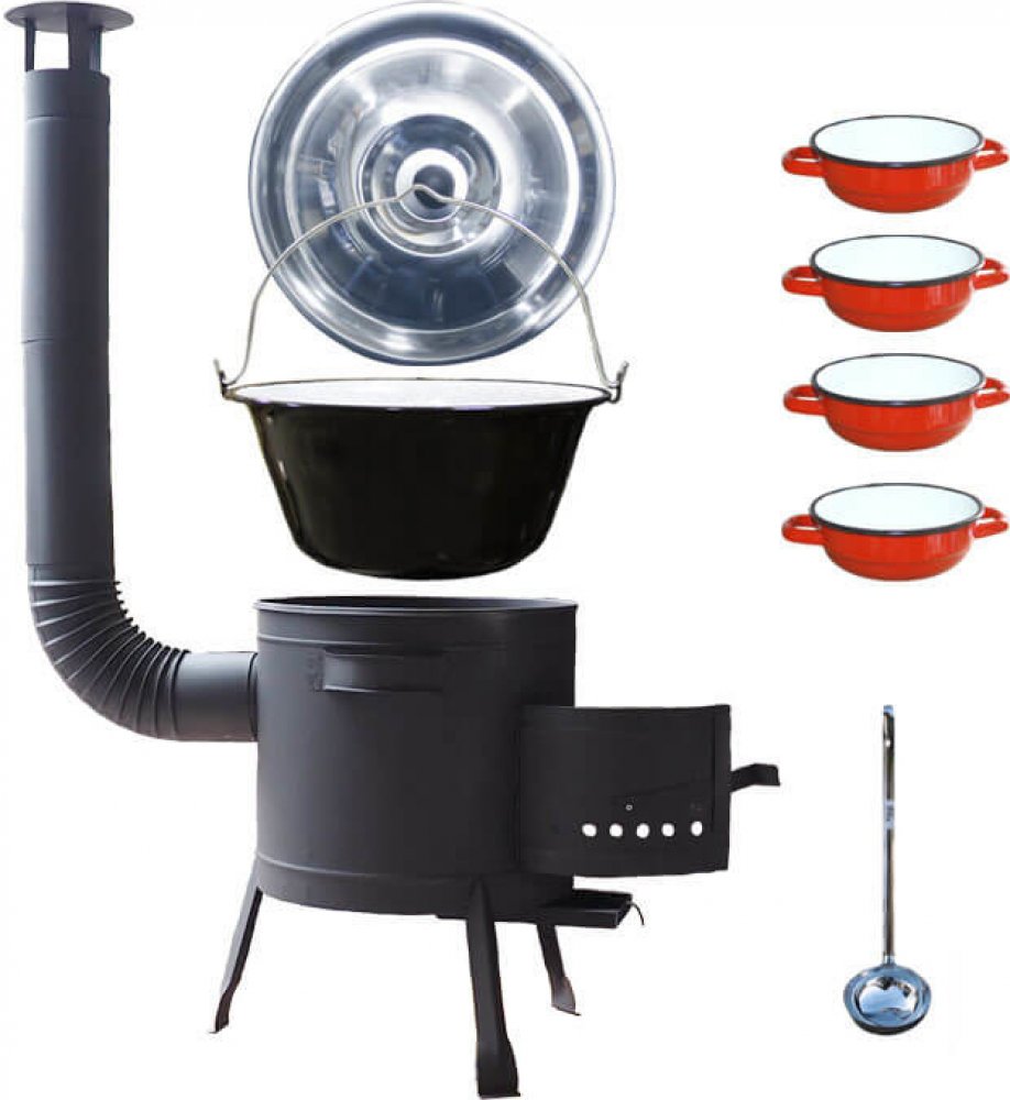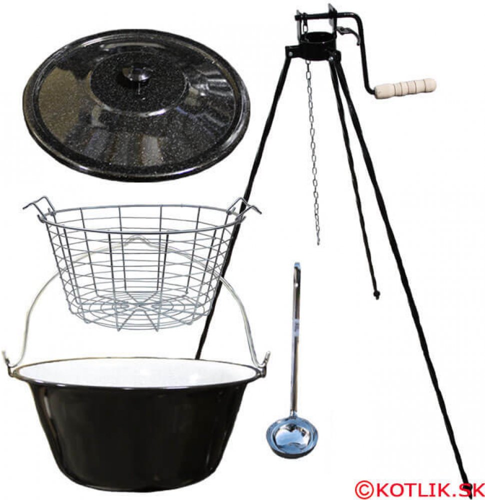 Kotlíková souprava obsahuje: Smaltovaný kotlík. Objem: 20 L. Nerezová poklice. Kovová kotlina natřená speciální, ochrannou žáruvzdornou barvou. Smaltované rendlíky 4 ks. Kvalitní nerezová naběračka. Objem 350 ml. Kotlíková souprava na outdorové vaření guláše a rybích polévek v přírodě, v zahradě nebo v otevřené kuchyně, především pro chalupáře, chataře, do kempu a na táboření.