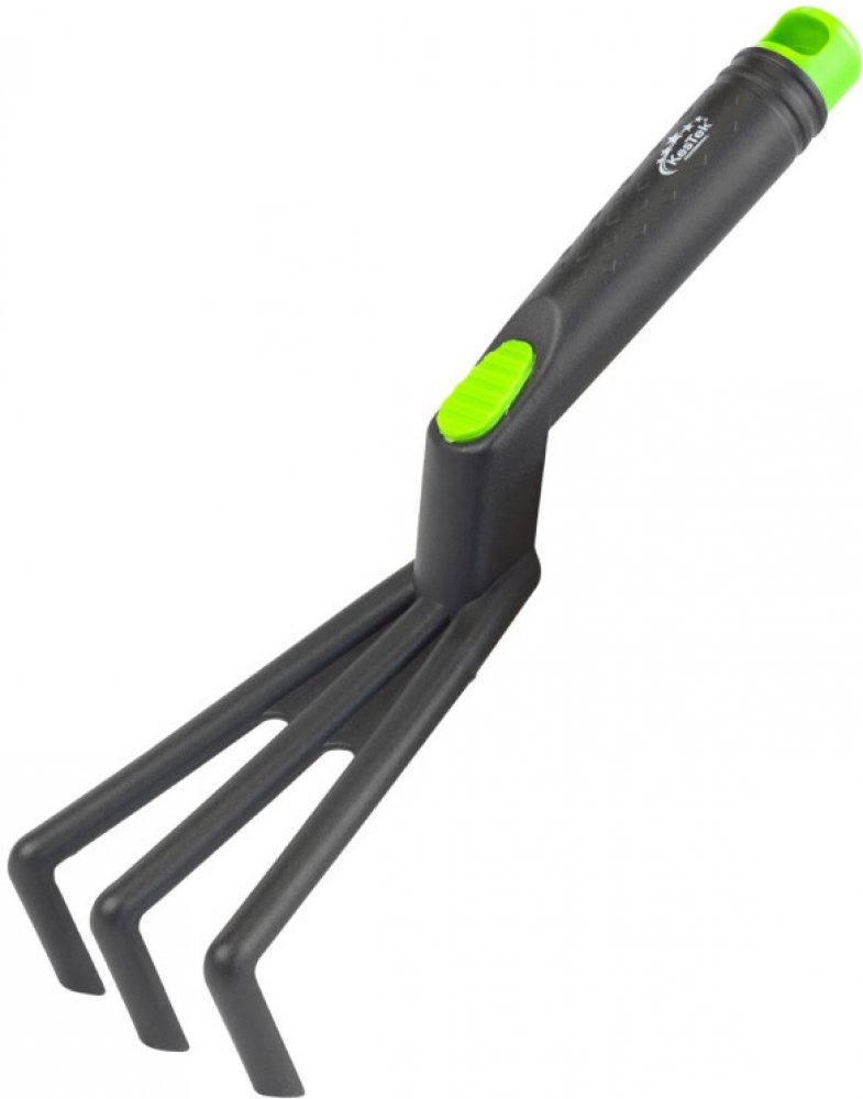 Ruční kultivátor v černém barevném provedení vyrobený z plastu, lehký a velmi pevný. Vhodný pro hrabání a zkrášlování zahrádky, květinových záhonů, balkonů nebo terasy. Tři zuby jsou pevně ukotveny a zajišťují tak stabilitu.