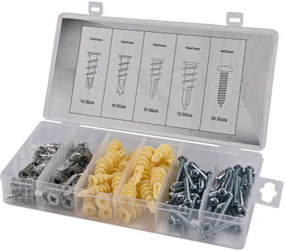 Plastové a kovové hmoždinky do sádrokartonu se zápustnými šrouby ve čtyřech různých velikostech. Souprava obsahuje 20 kovových hmoždinek, 30 plastových hmoždinek a 50 příslušných šroubů. Všechny dodané hmoždinky do sádrokartonu jsou vybaveny samořezným závitem, a tak nejsou zapotřebí žádné další seřizovací nástroje a hmoždinky můžete přišroubovat šroubovákem nebo bitem přímo do zdi. Praktický box na sortiment s euroděrováním zajišťuje uspořádané a prostorově úsporné uskladnění hmoždinek a šroubů. Vhodné pro sádrokartonové a sádrové vláknité desky.