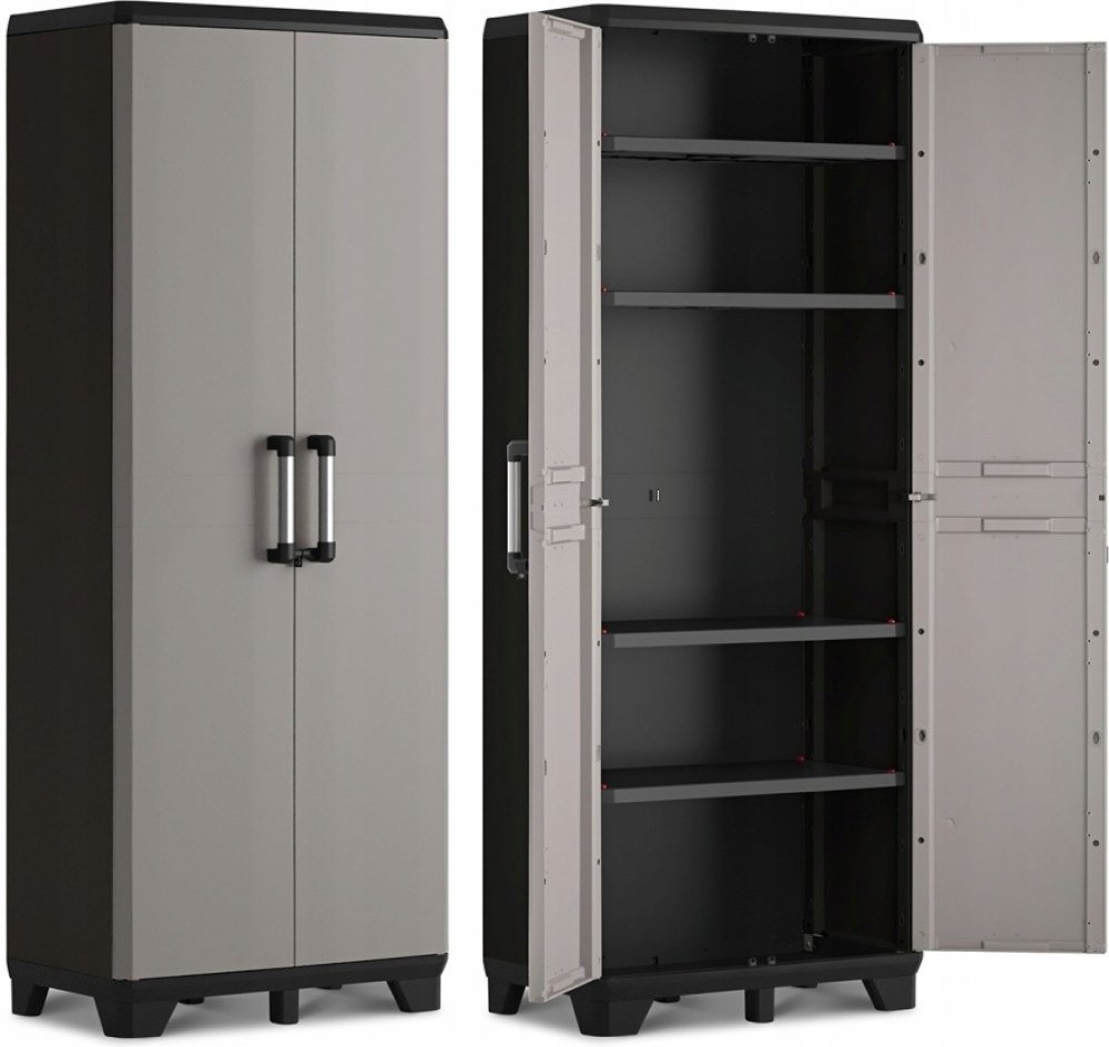 Prostorná skříň PRO TALL od značky KETER je ideální pomocník do garáže, na chatu, na terasu nebo do sklepa. Skříň je vybavena pevnými panty a je možné ji uzamknout. Velkou předností skříně jsou čtyři nastavitelné police s nosností 20 kg.