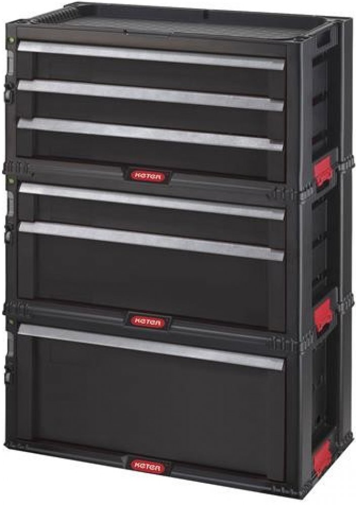 Úložný box na nářadí obsahuje dvě hluboké zásuvky s odnímatelnými přihrádkami, do kterých můžete uložit velké a těžké nástroje. Další 4 zásuvky slouží pro uložení drobnějších nástrojů a příslušenství. Jedna ze čtyř menších zásuvek je vybavena 16 vyjímatelnými organizéry na drobné příslušenství, jako jsou hřebíky, šroubky, hmoždinky a jiné drobnosti. Organizéry umožňují snadné roztřídění příslušenství podle druhů a velikostí. Všechny dělící příčky v zásuvkách lze snadno vyjmout a vytvořit tak volný prostor pro větší nástroje. Každý samotný blok se zásuvkami lze zajistit proti otevření vestavěným posuvným zámkem. Nechybí ani očko pro zajištění visacím zámkem.