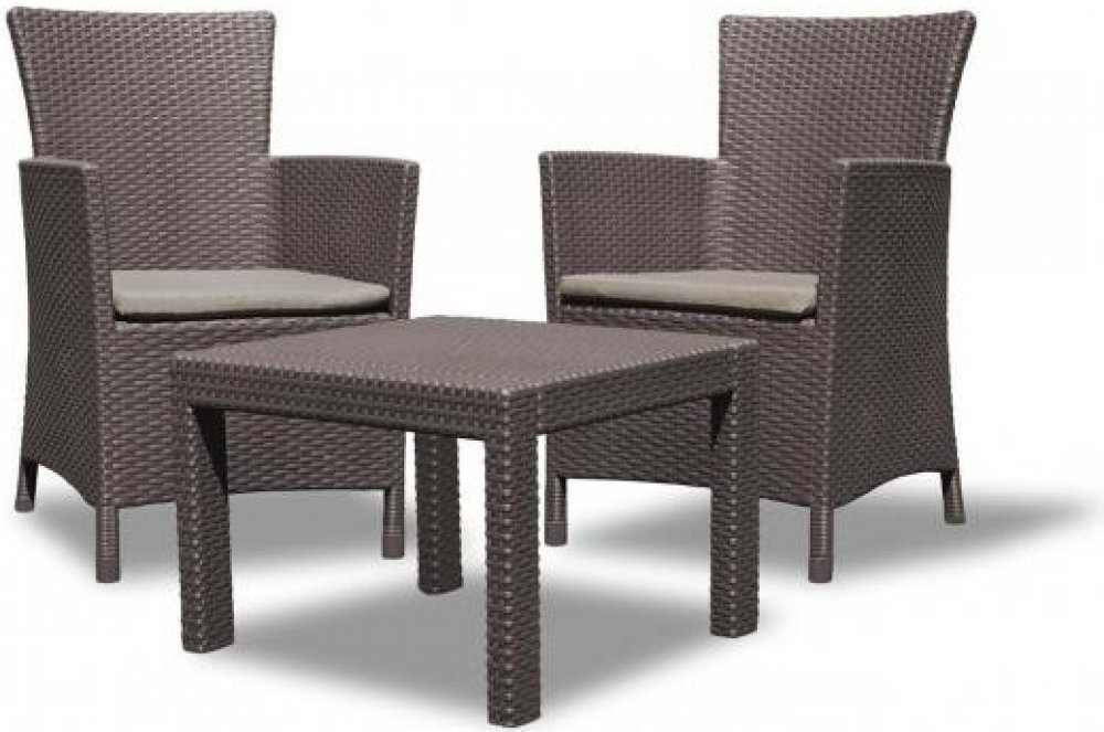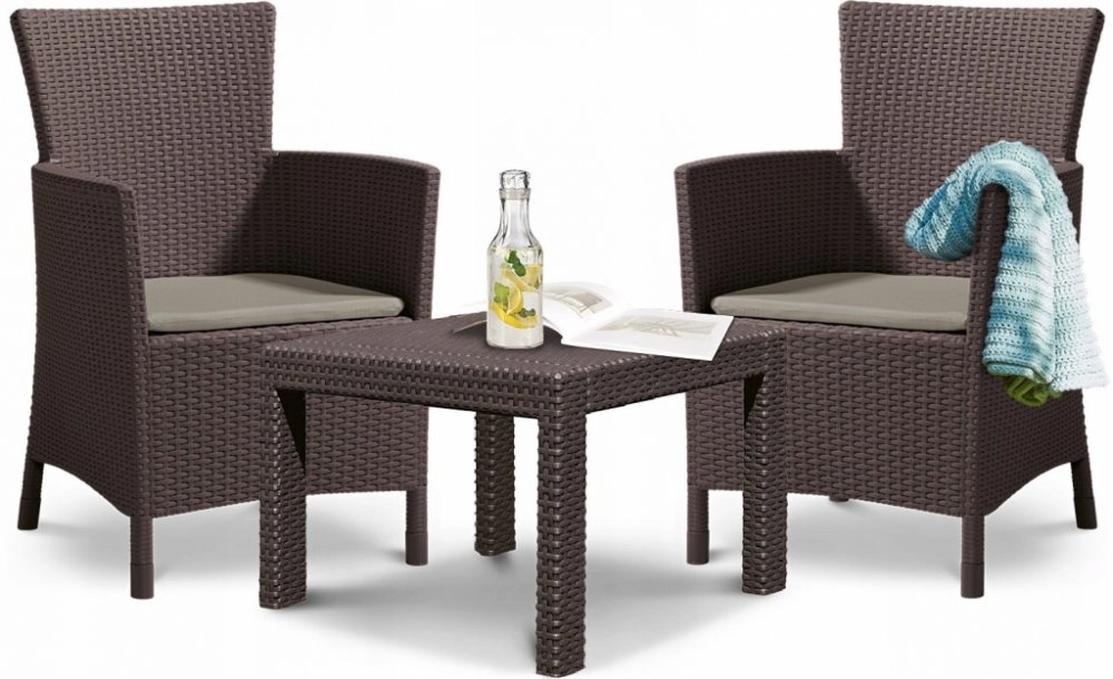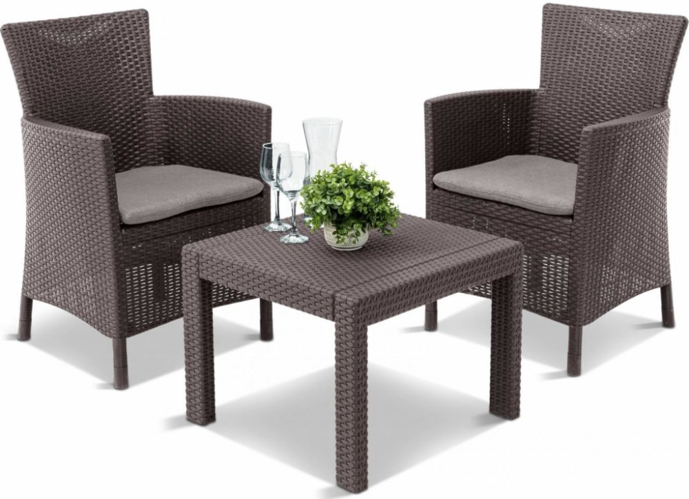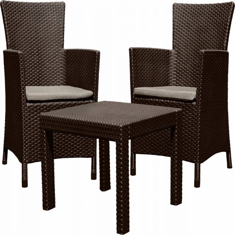 Balkónový komplet Allibert Rosario Brown Komfortní komplet zahradního nábytku z vysoce kvalitního plastu v imitaci přírodního ratanu. Pohodlná křesla s vysokou opěrkou jsou doplněna stylovým kávovým stolkem. Křesla jsou doplněna měkkými polstrovanými sedáky. Sestava je pro své rozměry vhodná na balkóny nebo menší terasy. Moderní designImitace ratanu je velmi žádaná, její vzhled se hodí na každou zahradu i terasu a je vhodný také do interiéru. Vysoce odolný materiálSouprava Rosario Brown je vyrobena z vysoce kvalitního polypropylenu, který je odolný proti nepřízni počasí, dešti i UV záření a vyniká vysokou životností. Vlastnosti :komplet obsahuje 2 pohodlná křesla a kávový stolekmateriál polypropylen v designu přírodního ratanu pohodlné polstrované sedáky snadné čištění vodouodolné vůči povětrnostním vlivům a UV zářenídodáváno rozložené k jednoduché montážikomplet je nutné chránit před mrazem Rozměry křesla : šířka - 62 cm / hloubka - 60 cm / výška - 96 cmRozměry stolku : délka - 59 cm / šířka - 59 cm / výška - 43 cm