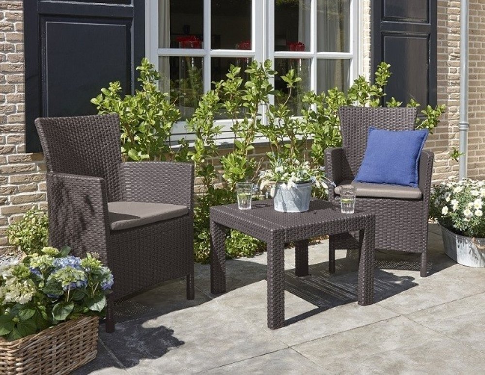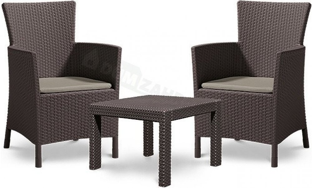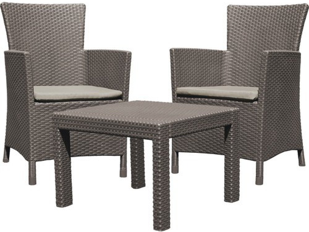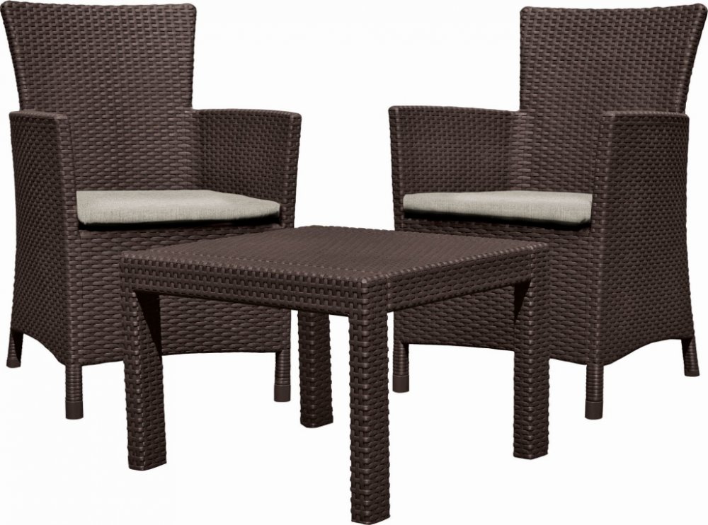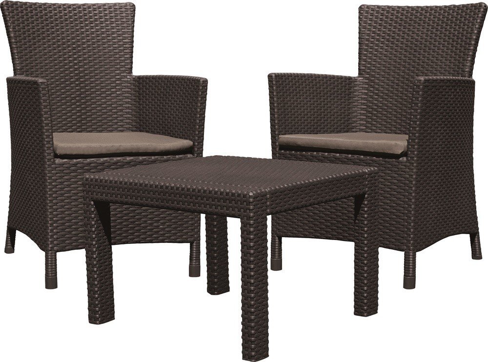 Balkónový komplet Allibert Rosario Brown Komfortní komplet zahradního nábytku z vysoce kvalitního plastu v imitaci přírodního ratanu. Pohodlná křesla s vysokou opěrkou jsou doplněna stylovým kávovým stolkem. Křesla jsou doplněna měkkými polstrovanými sedáky. Sestava je pro své rozměry vhodná na balkóny nebo menší terasy. Moderní designImitace ratanu je velmi žádaná, její vzhled se hodí na každou zahradu i terasu a je vhodný také do interiéru. Vysoce odolný materiálSouprava Rosario Brown je vyrobena z vysoce kvalitního polypropylenu, který je odolný proti nepřízni počasí, dešti i UV záření a vyniká vysokou životností. Vlastnosti :komplet obsahuje 2 pohodlná křesla a kávový stolekmateriál polypropylen v designu přírodního ratanu pohodlné polstrované sedáky snadné čištění vodouodolné vůči povětrnostním vlivům a UV zářenídodáváno rozložené k jednoduché montážikomplet je nutné chránit před mrazem Rozměry křesla : šířka - 62 cm / hloubka - 60 cm / výška - 96 cmRozměry stolku : délka - 59 cm / šířka - 59 cm / výška - 43 cm
