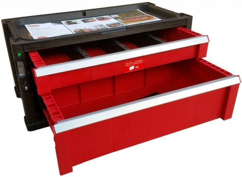 Praktická 2zásuvková skříňka na nářadí nabízí prostor pro množství nářadí a příslušenství v dílně nebo garáži. Obsahuje hlubokou zásuvku s vyjímatelnými přepážkami na větší a těžší nářadí. Nízká zásuvka umožní uložit menší nářadí, příslušenství a předměty.