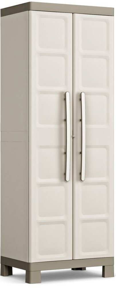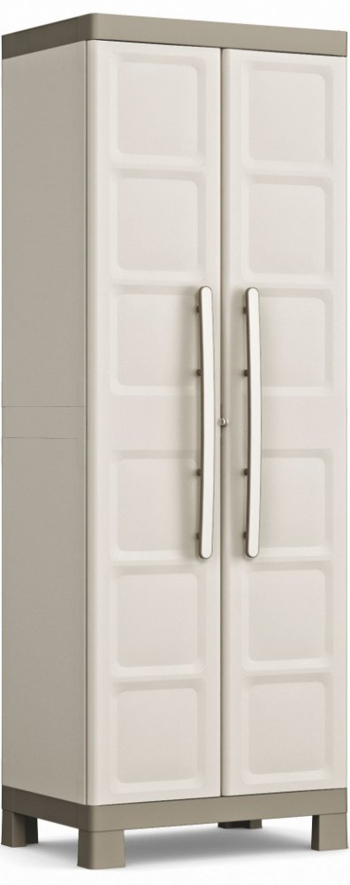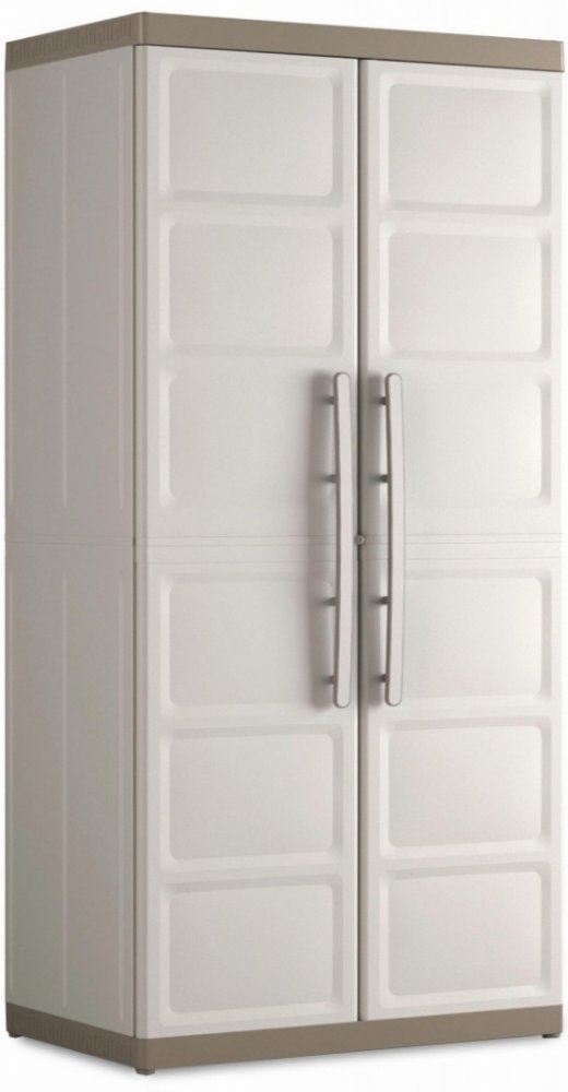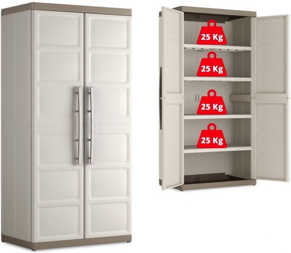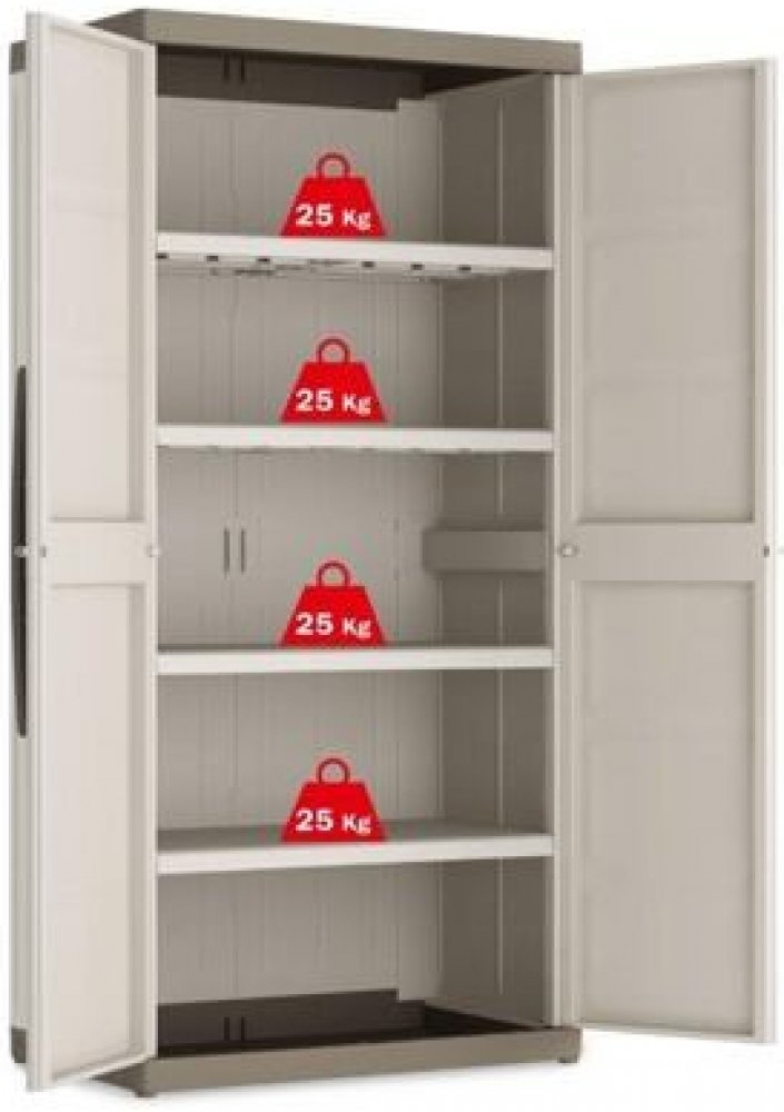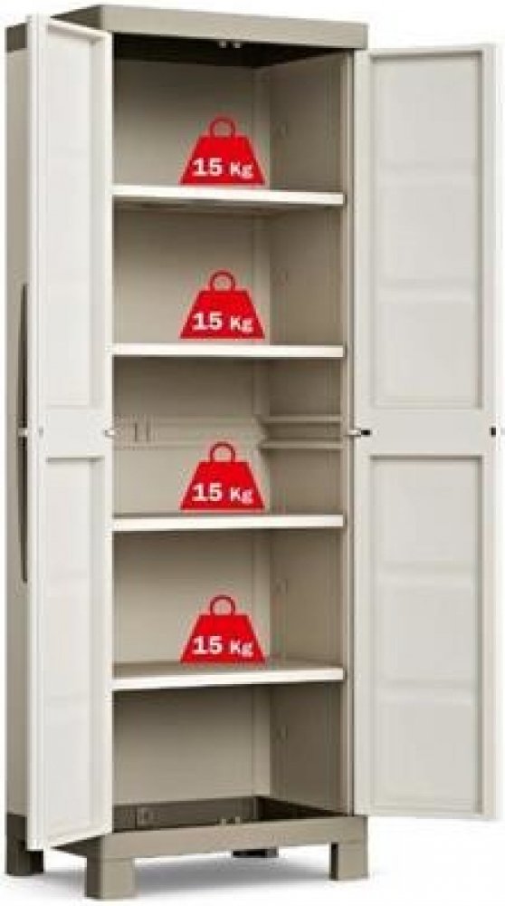 Skříň obsahuje celkem 4 přídavné police – každá s výraznou nosností až 25 kg, které přijdou vhod pro výrazně těžší předměty všeho druhu. Lze ji tedy využít pro skladování dílenského nářadí či zahradnických potřeb, kdy přijde vhod pro uložení náčiní s dlouhou násadou, které by se jinam nevešlo. Díky svému provedení v univerzální béžové barvě zapadne do každého prostoru bez ohledu na jeho konceptuální styl.