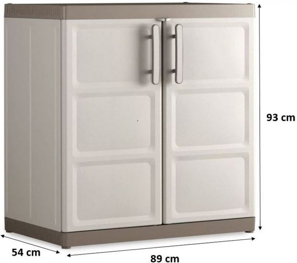Skříň obsahuje celkem 2 přídavné police - každá s výraznou nosností až 25 kg, které přijdou vhod pro výrazně těžší předměty všeho druhu. Lze ji tedy využít pro skladování dílenského nářadí či zahradnických potřeb, kdy přijde vhod pro uložení náčiní s dlouhou násadou, které by se jinam nevešlo. Díky svému provedení v univerzální béžové barvě zapadne do každého prostoru bez ohledu na jeho konceptuální styl.