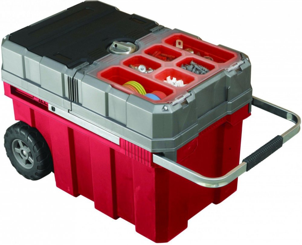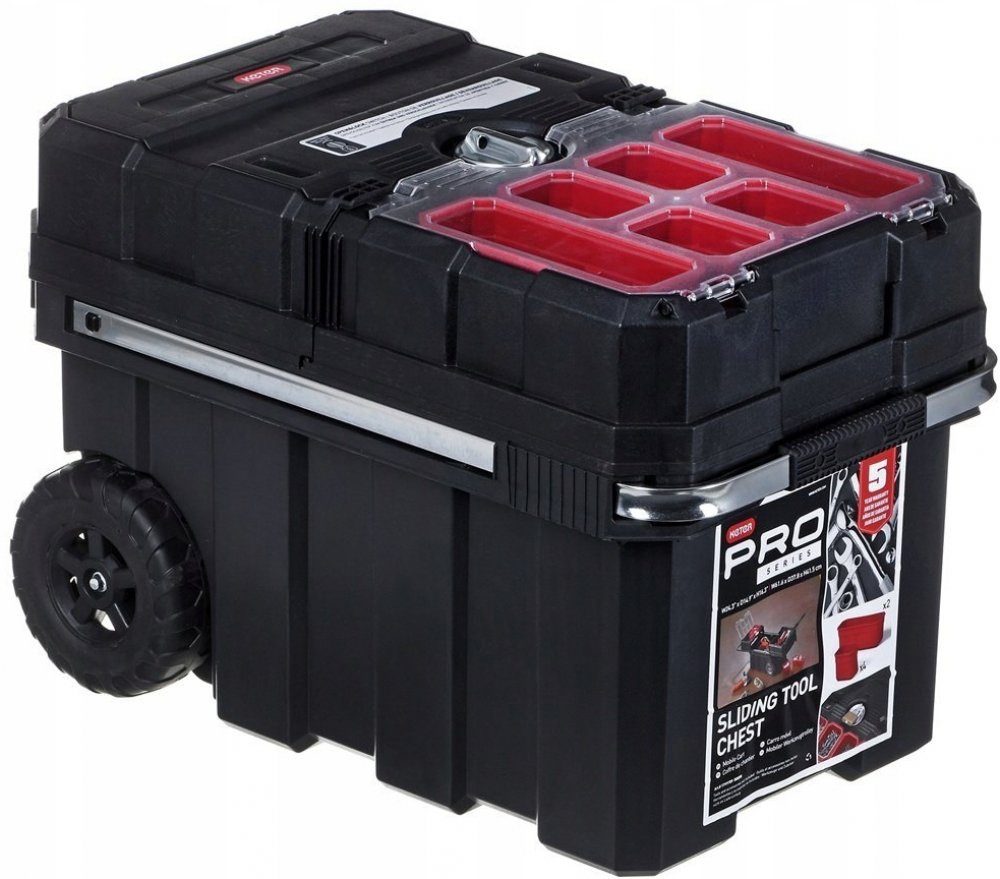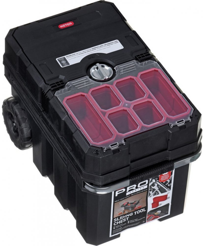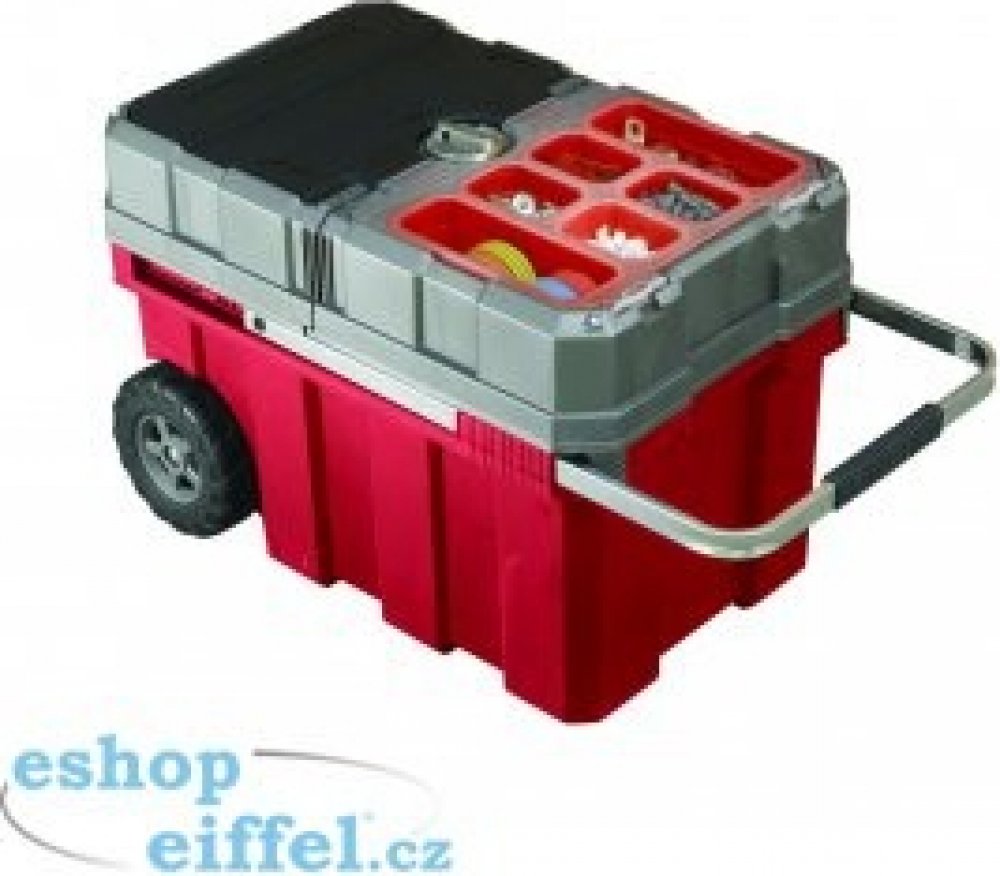 Kovová rukojeť s měkčenou částí pro dlaň a gumová kolečka dotvářejí souhru všech materiálů. Součástí je i systém centrálního zamykání, který chrání obsah za všech okolností. Do posuvné části uložíte 6 odnímatelných červených přihrádek.
